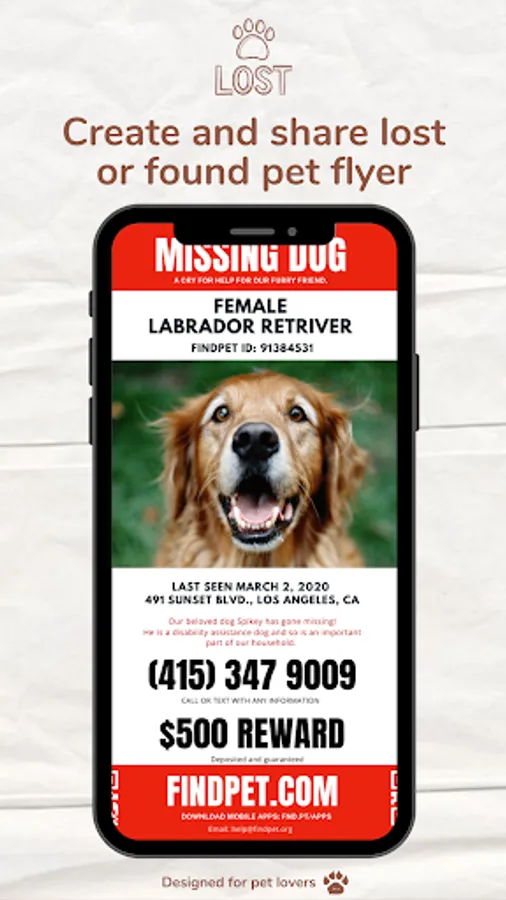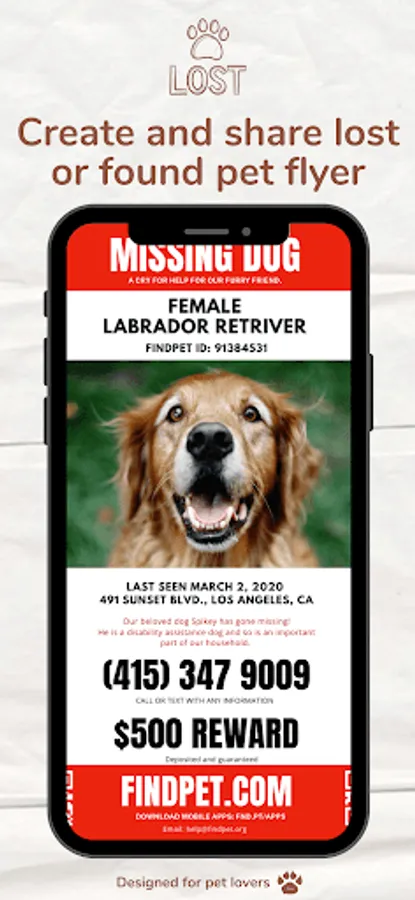 3) Generate the lost pet flyer and place them around your neighborhood.