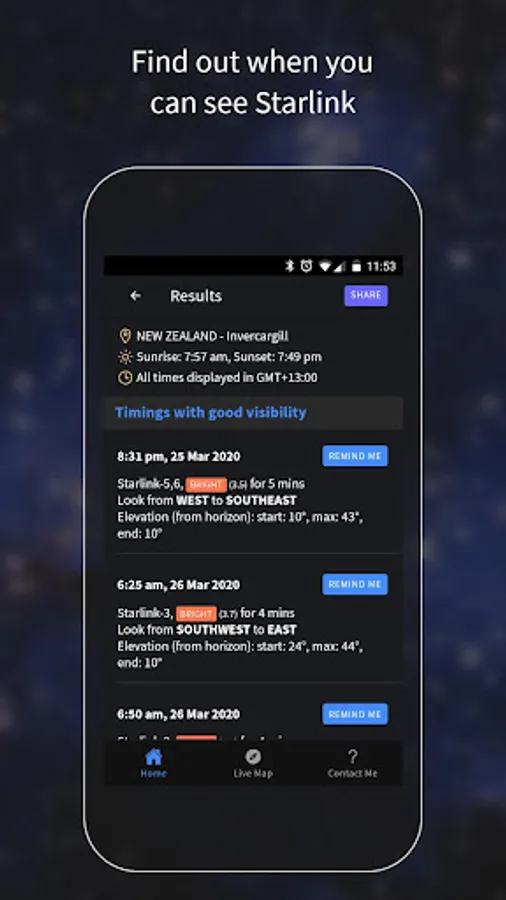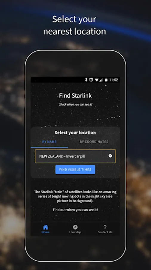 Designed to be simple and easy to use. First, please select your nearest city (or coordinates), and click on 'Find Visible Times'. The app will list the times when you can see Starlink. You can also click 'Remind me' next to any timing, to get a reminder 30 minutes before Starlink will be visible at your location. A 'Live Map' lets you track where Starlink is currently in the world.