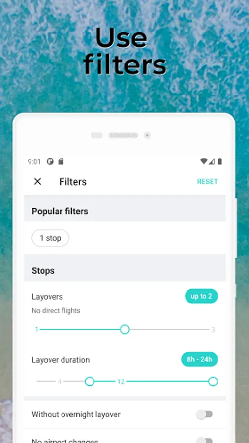 Filter the WANDR results to quickly find the ticket you want: direct flights, transfers, duration, airport changes, flight times, airports, airlines, agencies, price.