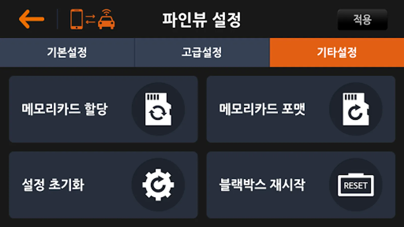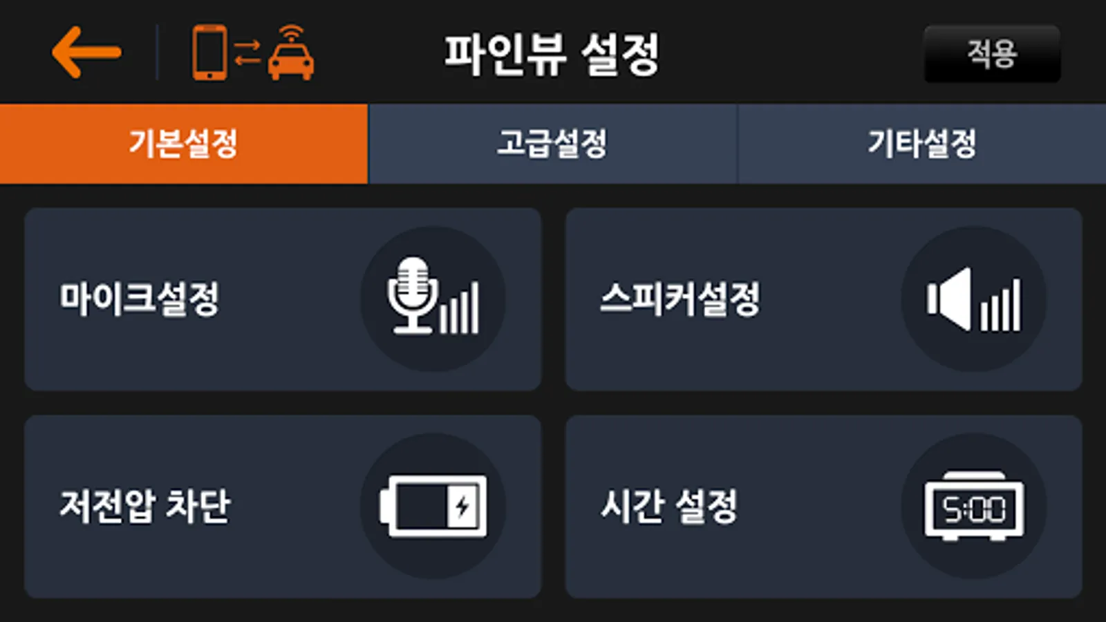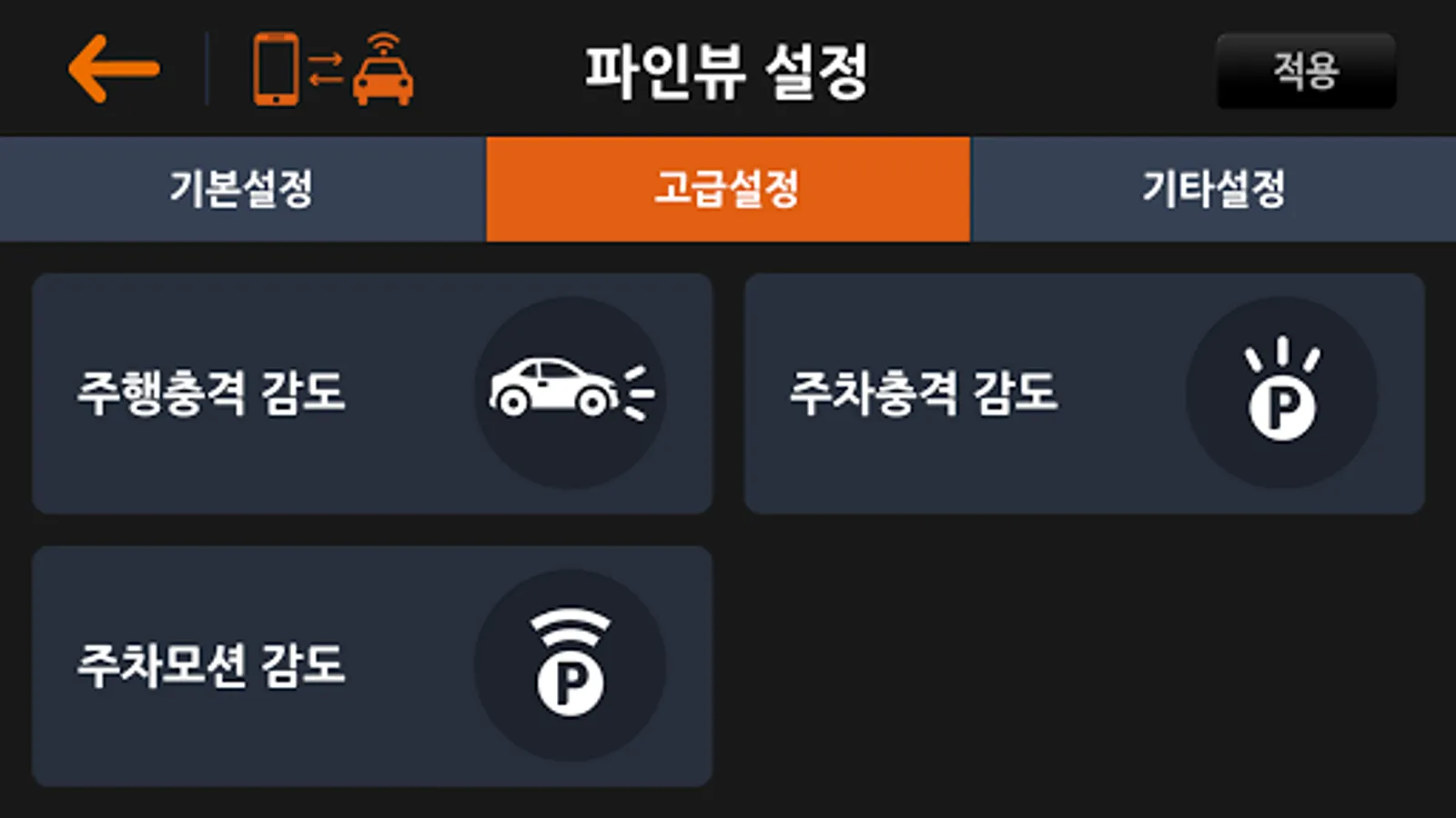 파인뷰 설정 : 민감도, 스피커, 전압 차단, 시간설정, 메모리 할당 설정 등을 할 수 있습니다.