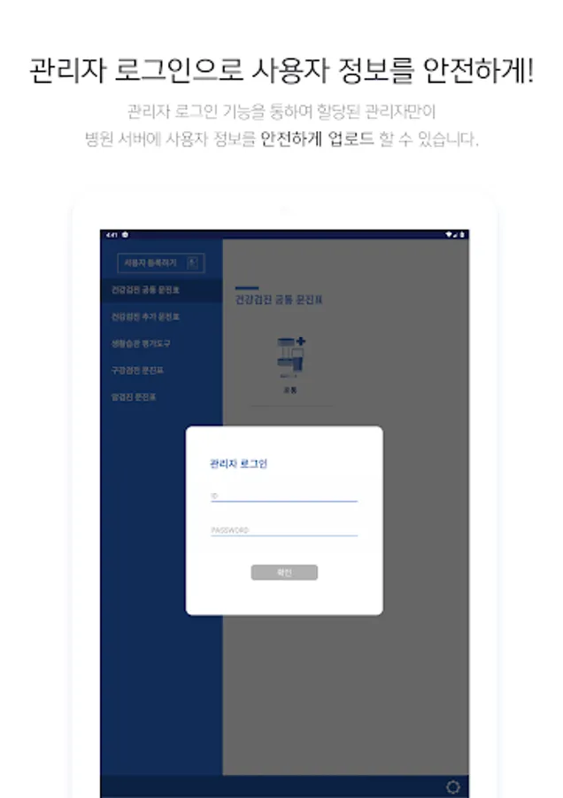 - Security is excellent because the questionnaire data of the device is deleted as soon as it is uploaded to hospital server.