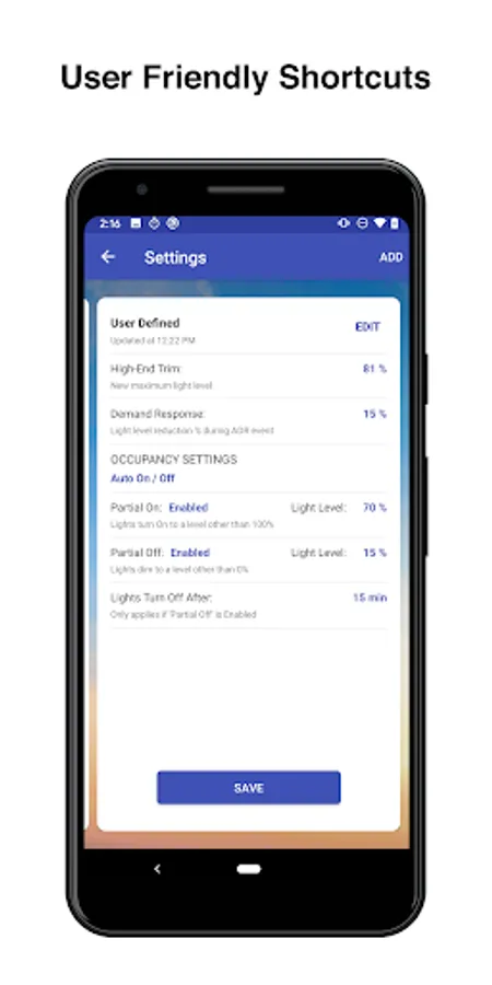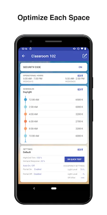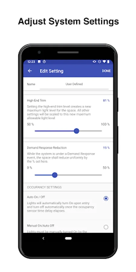 Customize each space system settings and adjust the High-End Trim of an over lit space with the slide of a finger. Manage Occupancy or Vacancy modes, as well as, the ability to add Partial Ons and/or Partial Offs based on building or code requirements. Demand Response lighting load reduction can be adjusted anywhere between 0-50% reduction (Title 24).