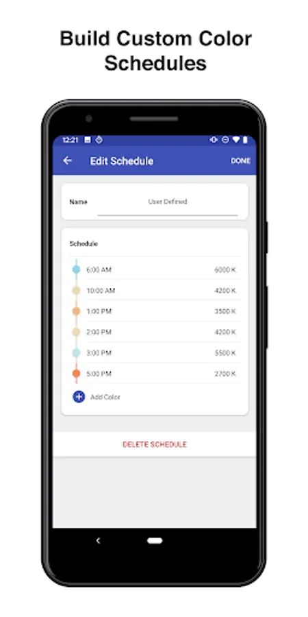 User created tunable white schedules and system settings can be saved as individual “cards”. A card is a way of saving custom schedule information or settings information into a consolidated profile that saves into the app and remains saved on the Android device. This allows users to easily go space to space and upload a custom schedule or system setting they had already created and saved.