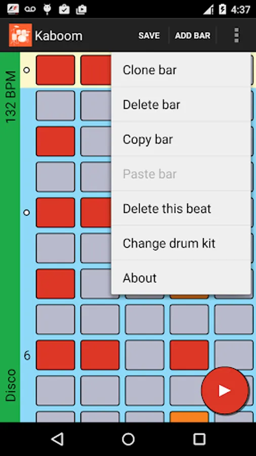 In the sequencer part you can create new drum beats or edit the existing ones and then save them on the device SD card. The drum beats are saved in a text files in a form very similar to that of a drum tabs so they can be read or even edited in any text editor app.