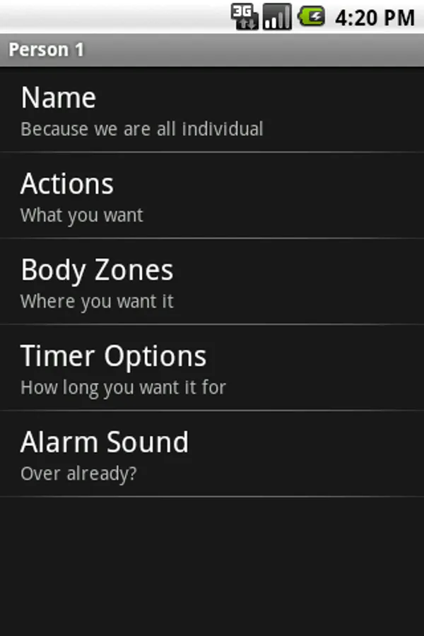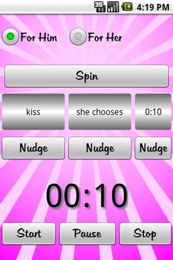 * Three spinners describe what actions you or your partner should do, where on the body and how long for.