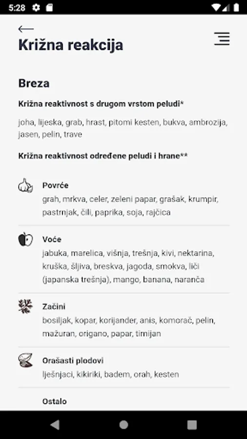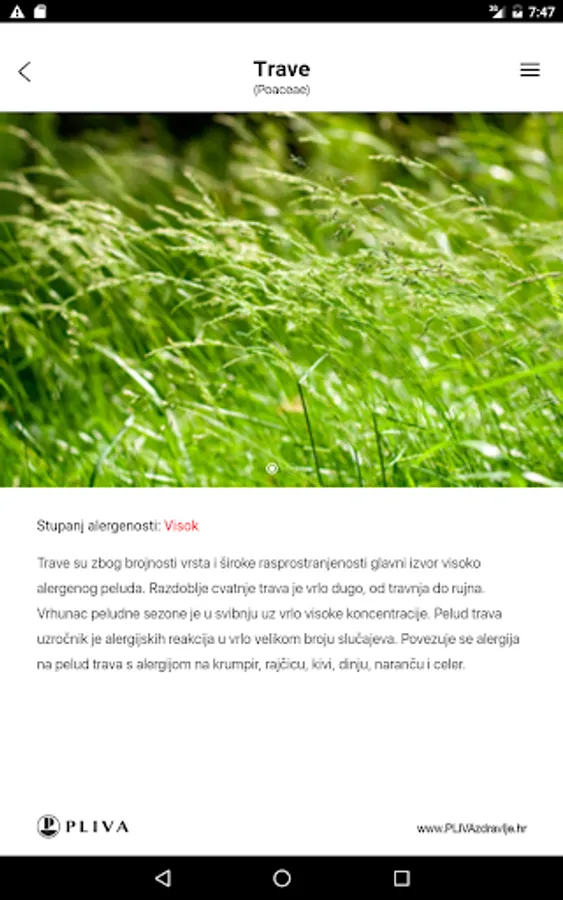 Application Hay forecast contains a list of the most common allergenic plants. With each plant is a photo and a description of the plant, as well as the code level of allergenicity. These data make it easier to identify allergens in plants in nature, and thus avoid contact with certain allergens.