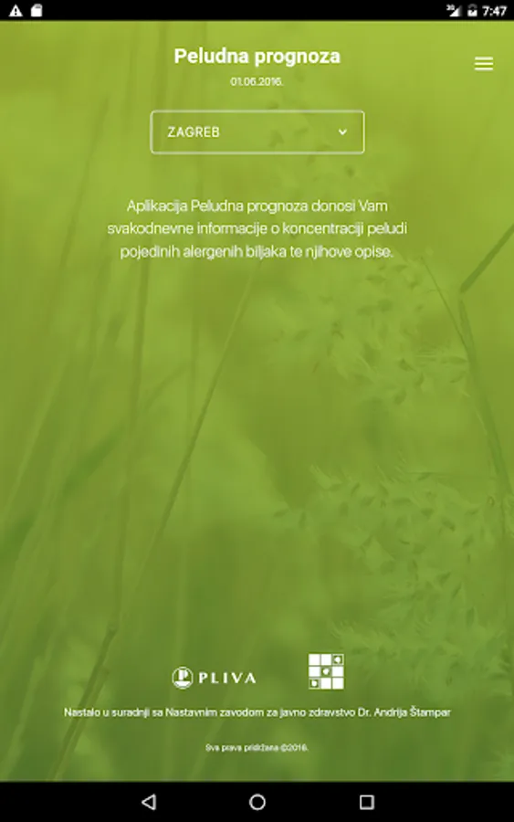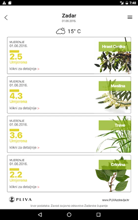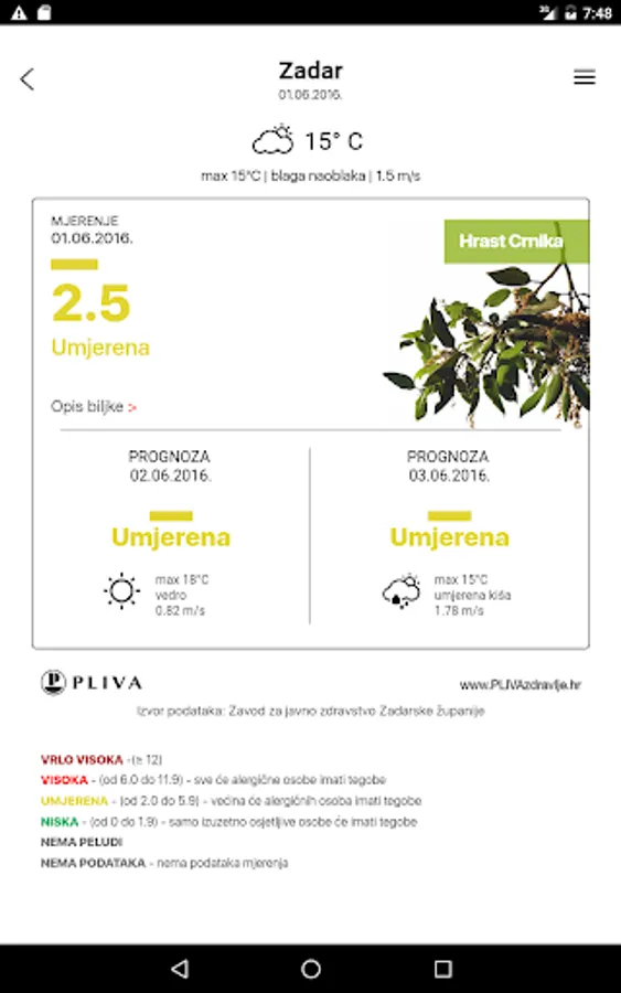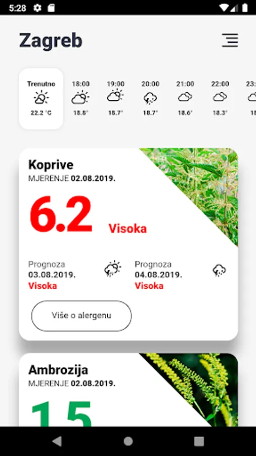 Application Hay Forecast delivers daily information on the concentration of pollen of certain allergenic plants and pollen forecast for the next two days, for all cities in Croatia guages.