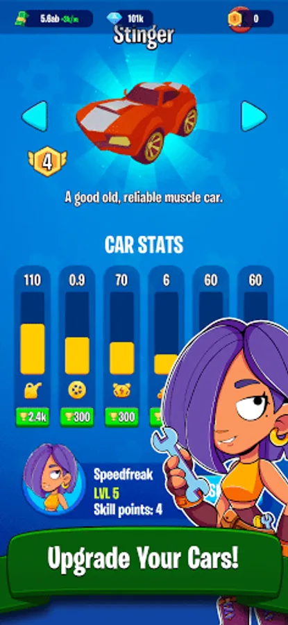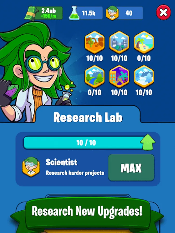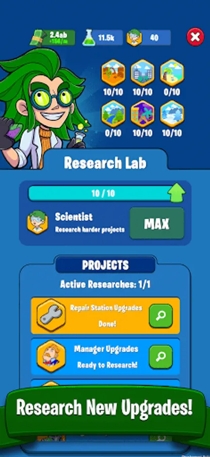 Manage your research lab to research permanent upgrades to your garage. Through the power of science become the ultimate garage empire tycoon!