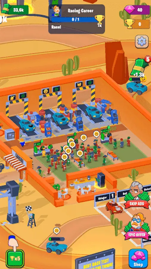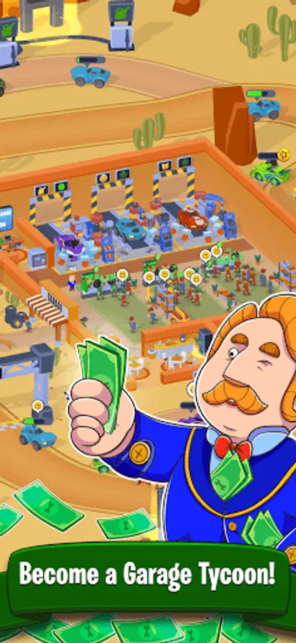 Build your garage tycoon empire from the ground up. Begin your journey with one humble garage, work on gaining customers, getting rich, managing staff, fixing cars and beating the rival garage boss to expand your idle empire to the next location!