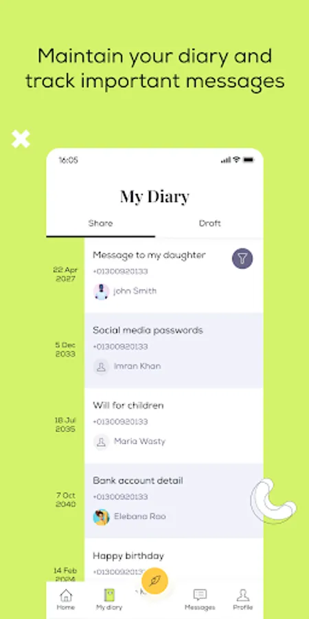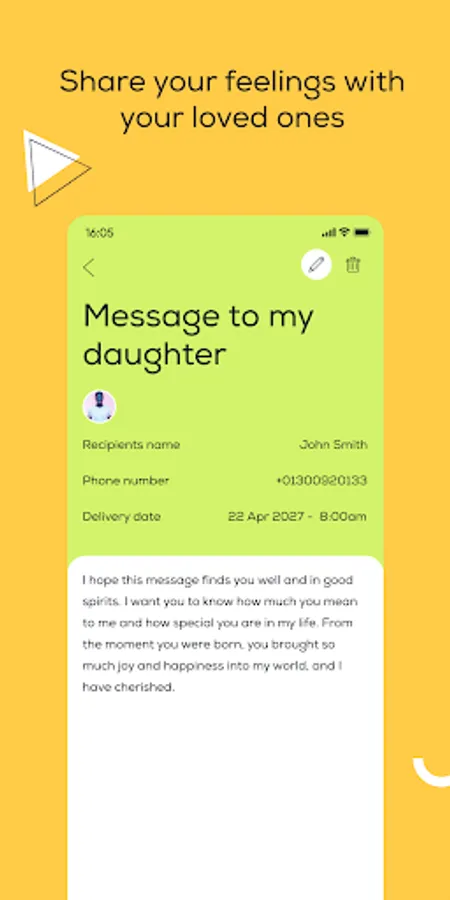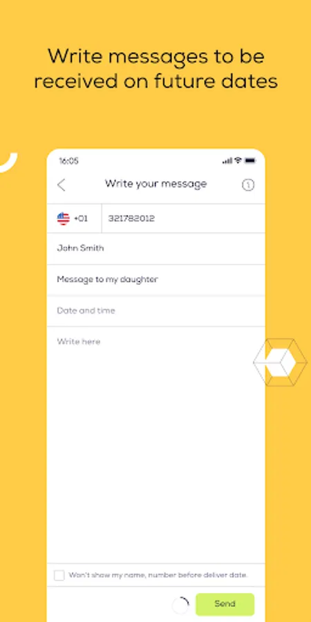 Set the date and time for your messages to be delivered. Whether it's a heartfelt note, important instructions, or a surprise message that you wish someone to read later, FinhApp ensures that your words reach the intended recipient at the perfect moment.