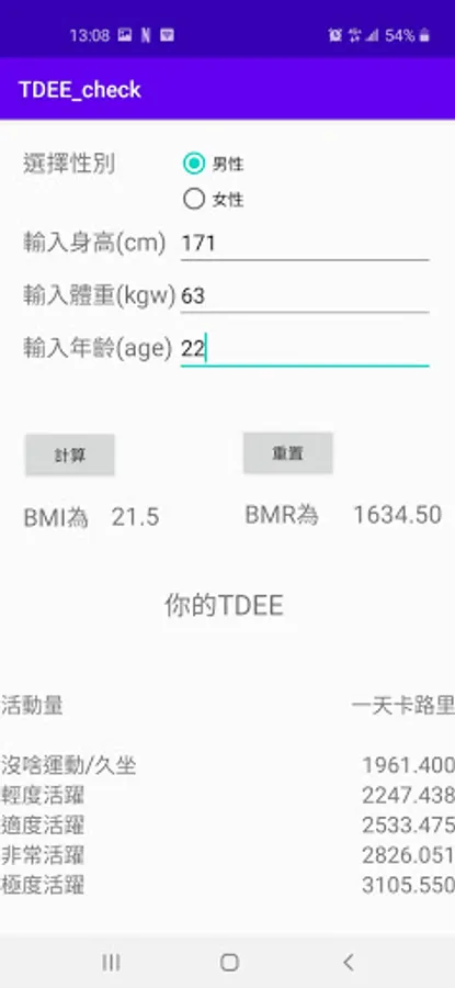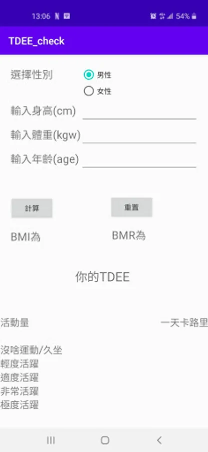 After entering the height, weight, and age, BMI, BMR, and TDEE values will be calculated for you.