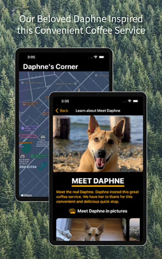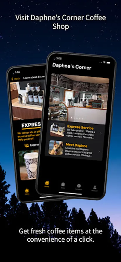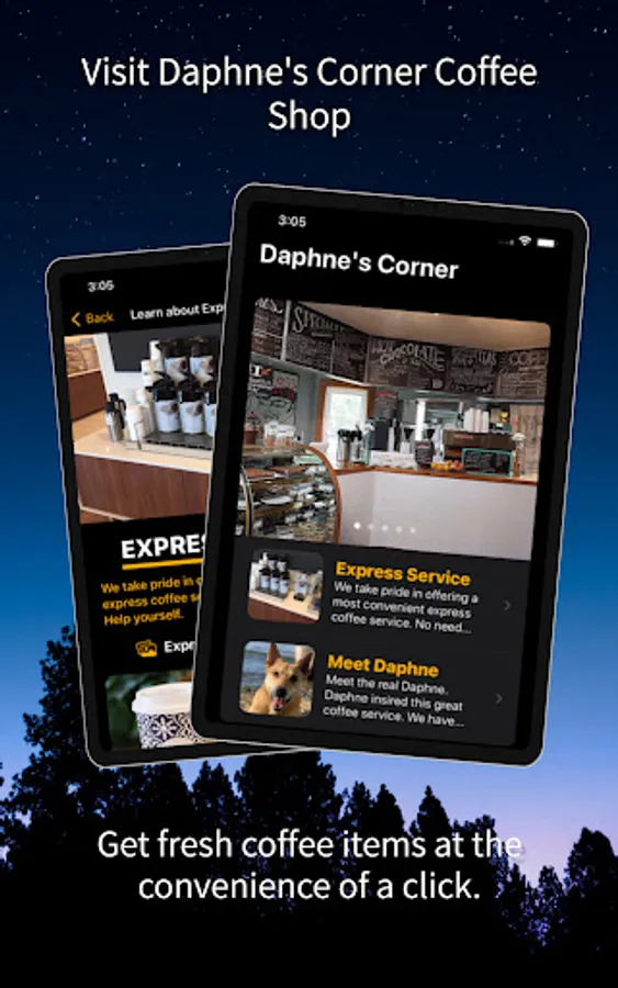 Daphne's Corner is a neat app for ordering coffee items. Just click the items you want, then purchase. Pickup your coffee items at the Daphne store location.