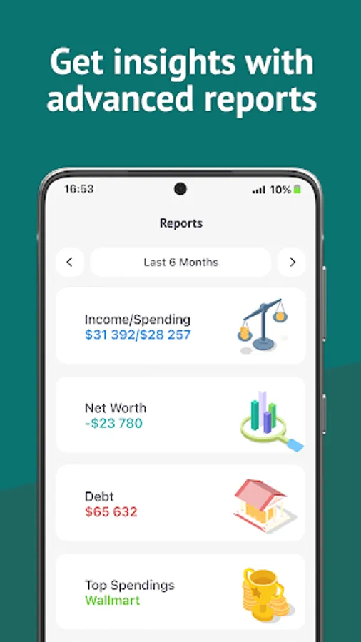 Our personal, simple budget app will help you track every dollar of your monthly expenses and income. You’ll see your net worth, spending and income report, top payees, debt reports, and other financial statements.