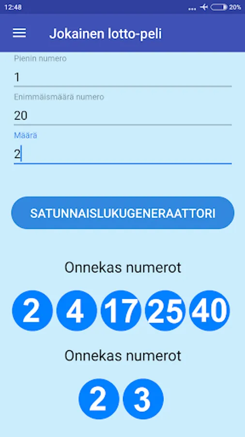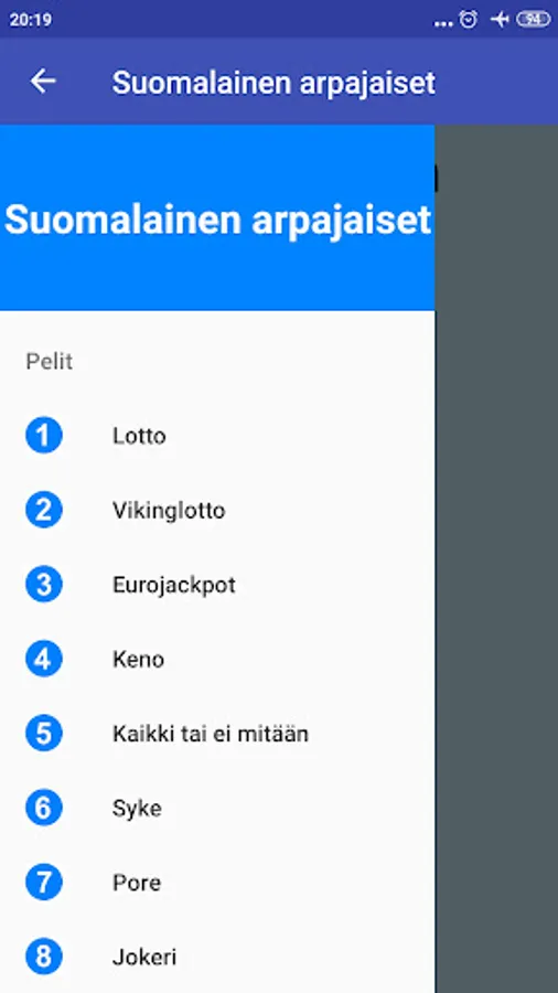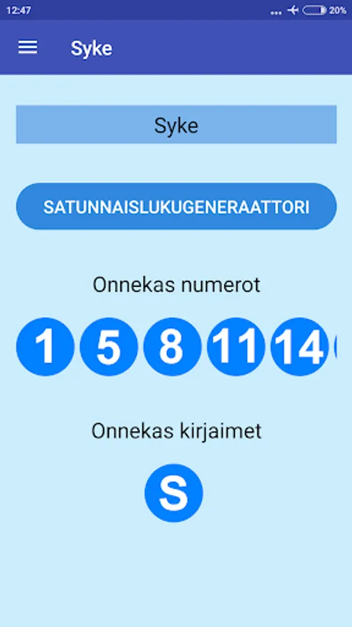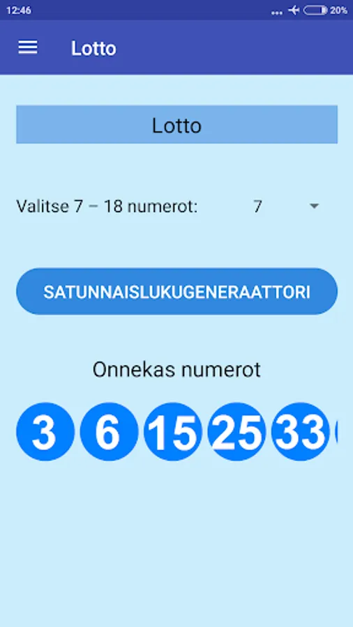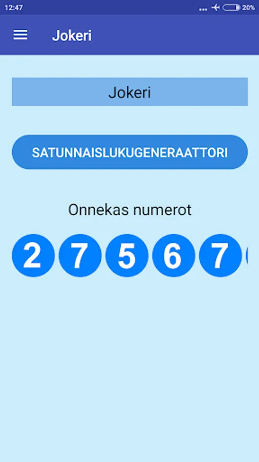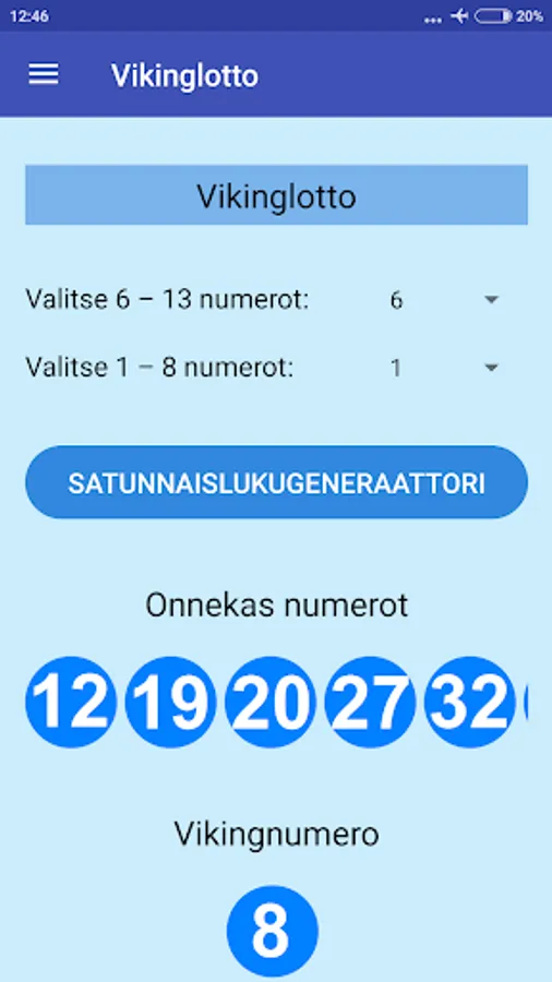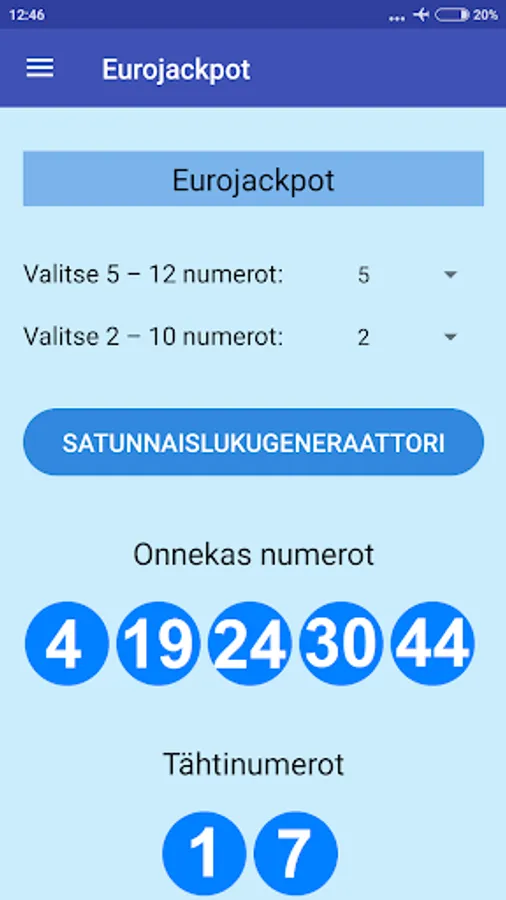 With this free application you can pick random numbers for the games Finnish Lotto, Vikinglotto, Eurojackpot, Keno, Syke, Pore, kaikki tai ei mitään, Jokeri and each lotto game.