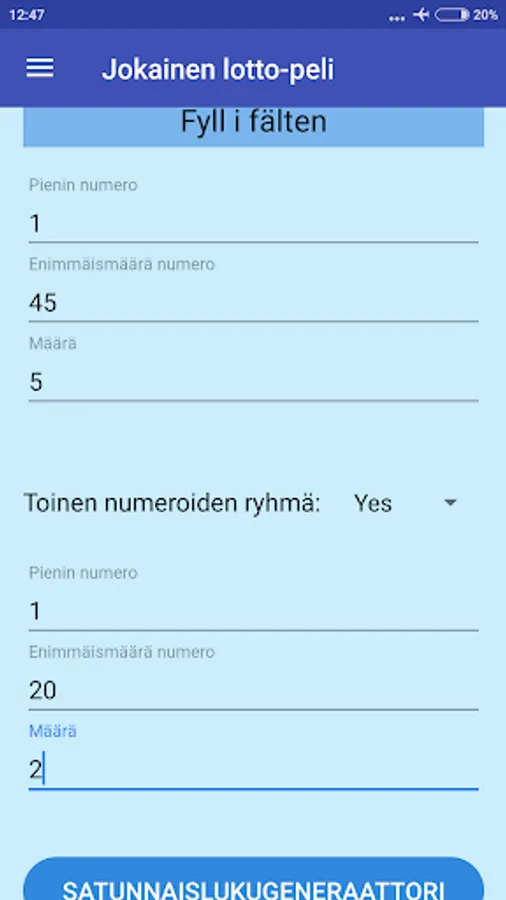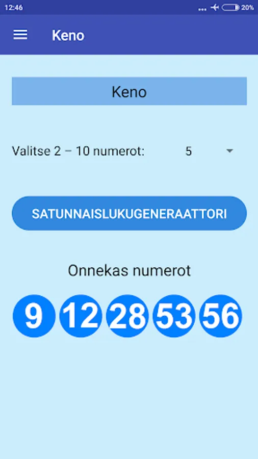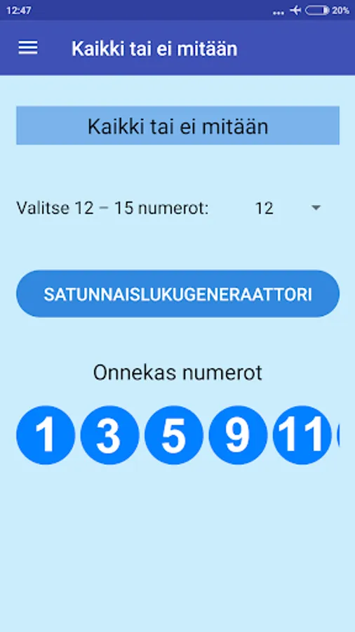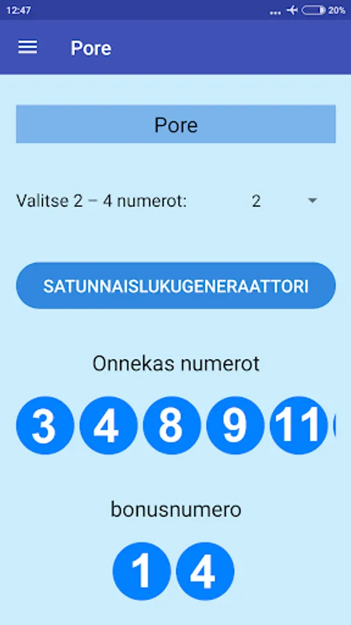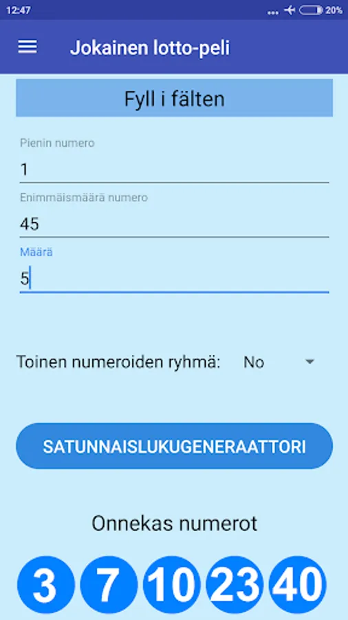 Tämän ilmaisen sovelluksen avulla voit valita satunnaisia numeroita pelejä varten Suomalainen Lotto, Vikinglotto, Eurojackpot, Keno, Syke, Pore, kaikki tai ei mitään, Jokeri ja jokainen lotto-peli.