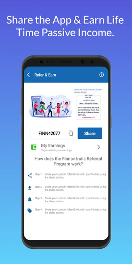 You can build your team by referring Finnov Partner App, You will get a Lifetime 2% income from your Referee's products selling income.