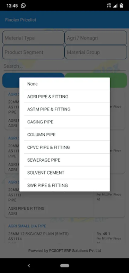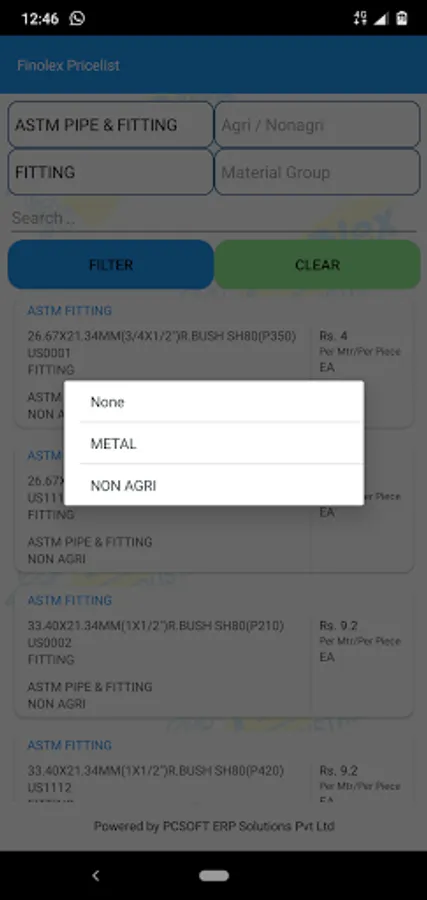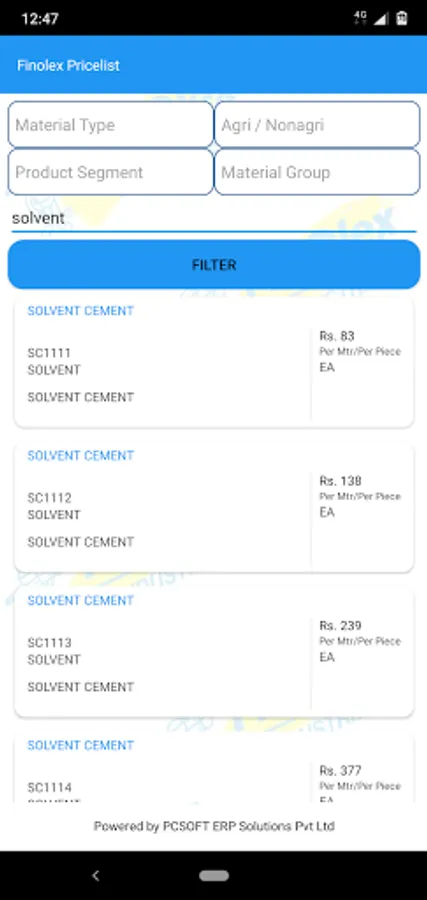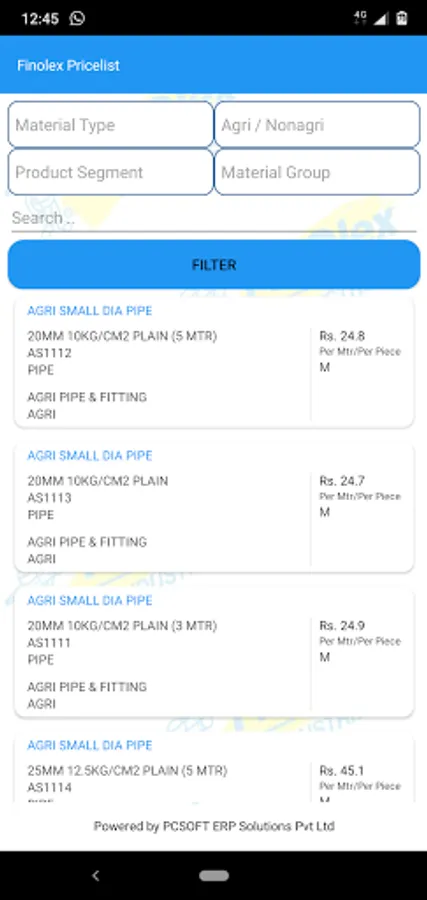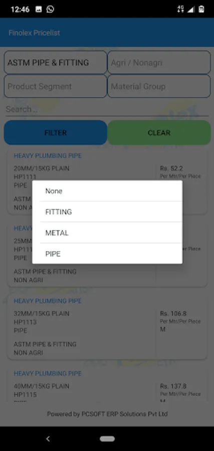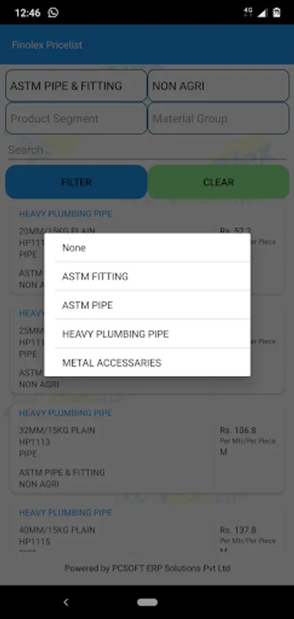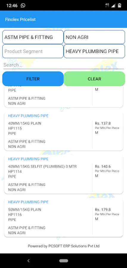 Finolex price list app, presents the entire product list with individual images.