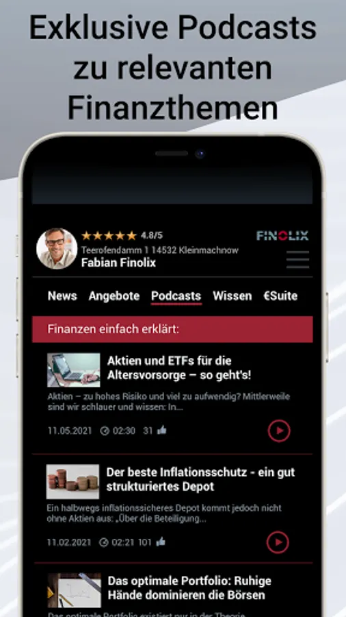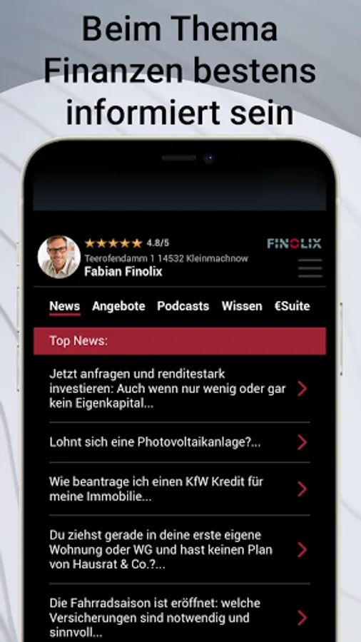 Benefit from the latest offers and news, understand better connections through our knowledge function - and listen to podcasts on the topic of money. Whether finances are more of a hobby or a duty for you, the FINOLIX app helps you to get and keep track of things.
