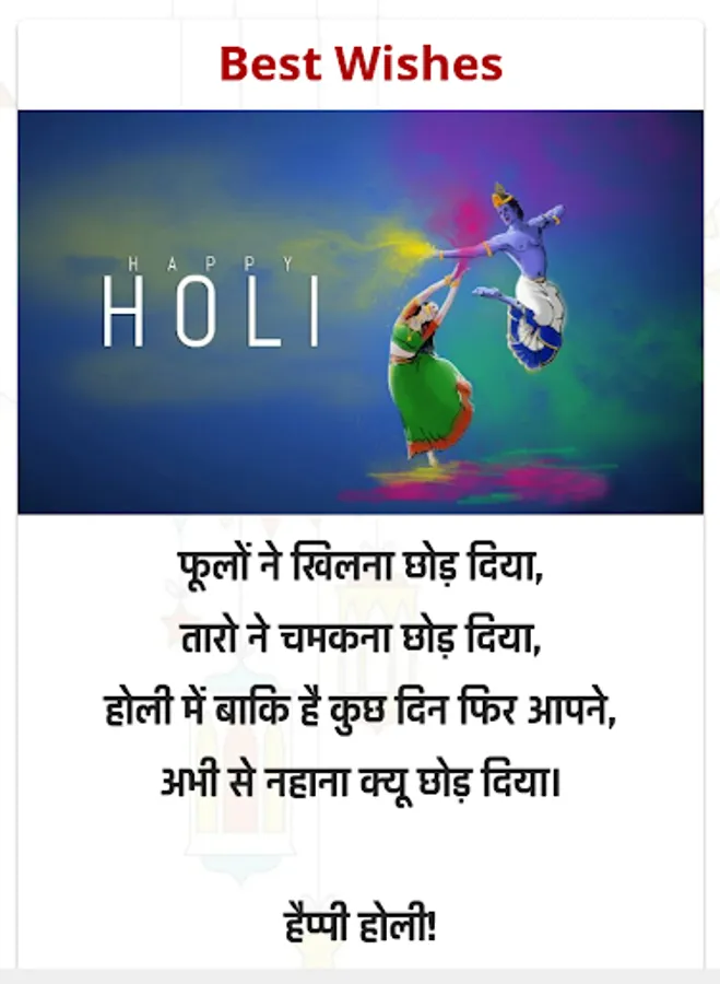 In view of this, we have brought an app for you, with the help of which you can easily share Wishes on all the festivals and can also add a status or your profile picture and you can do all this with very ease. With the small size app, you can get all the festival greetings in one place. Download Now!
