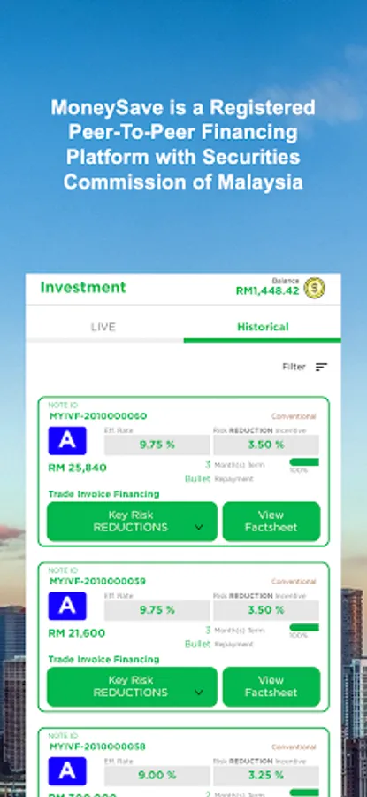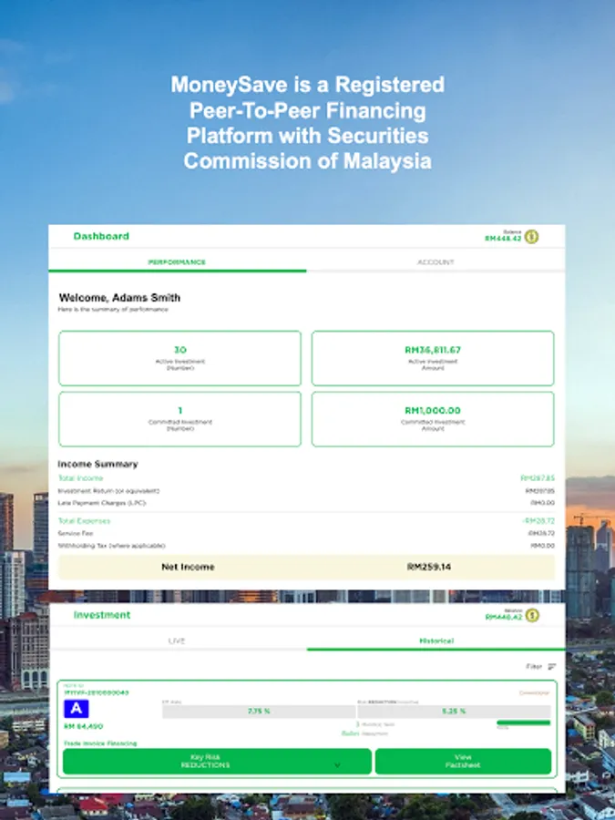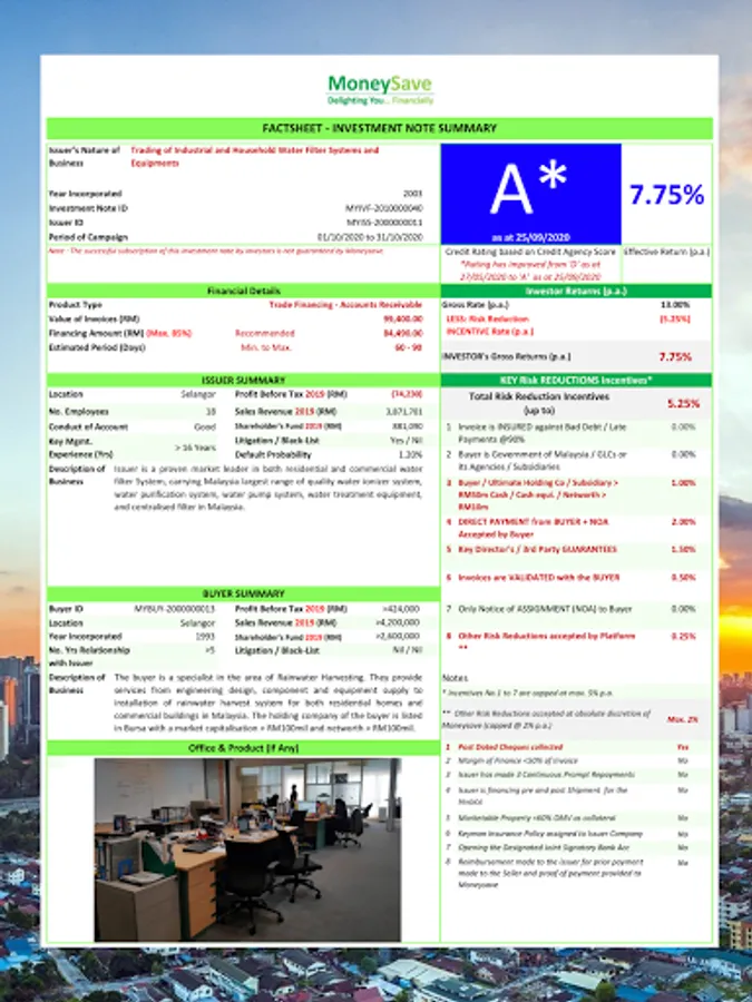 MoneySave (M) Sdn Bhd (‘MoneySave’ or ‘the Company’ or ‘the Company’ or ‘the platform’ or ‘P2P operator’) is a registered Recognized Market Operator in Malaysia, whose ordinary course of business is to conduct peer-to-peer (P2P) financing platform that facilitates directly or indirectly the issuance, execution or offering of an investment note or an Islamic investment note (for example Working Capital Financing, Trade Invoice Financing, Asset Based Financing, and Business Insurance Financing), offering Investors the opportunity to provide financing to the Issuer.
