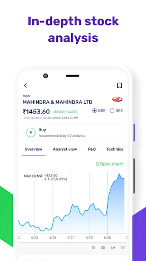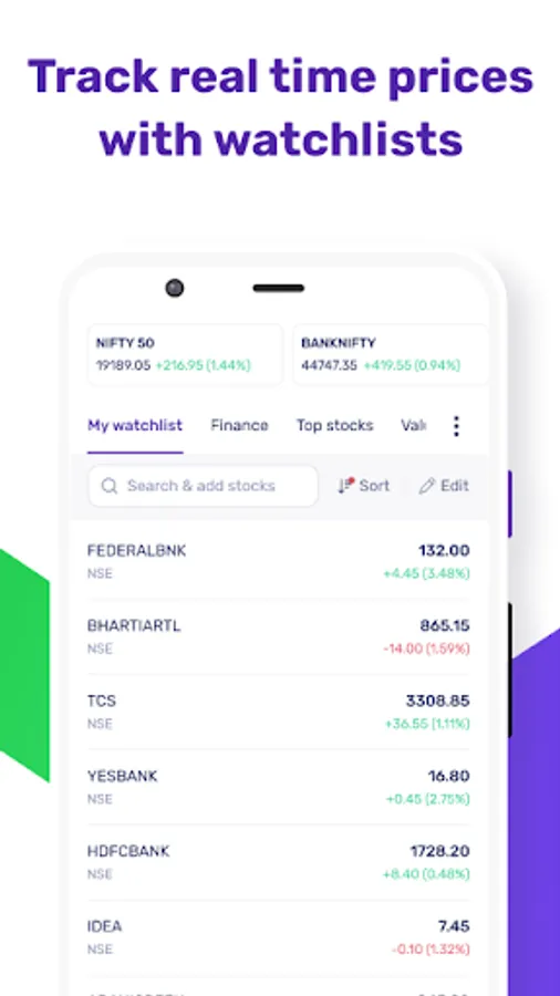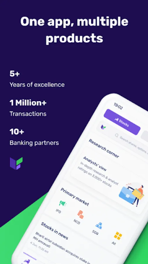 5. Take control with our advanced features & invest with confidence - Powerful & dynamic market section, track multiple Indian & global benchmarks, market depth view, comprehensive order book, intuitive UI to view positions and cumulative P&L, insightful portfolio with real-time profit & loss information, filter portfolio on profitability, asset class, customisable stock watchlists, smart search, option chain view, global market update, text to speech search, market pulse, ETF tracker & many more which acts as an investment advisor app