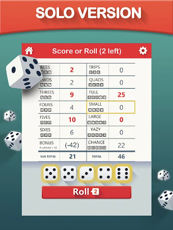 You have to score once and only once in each category box. You must think, judge and develop your skills to progress and improve your gaming abilities. As the game unfolds your category boxes start to run out. The objective is to achieve the highest score from these 13 rounds.
