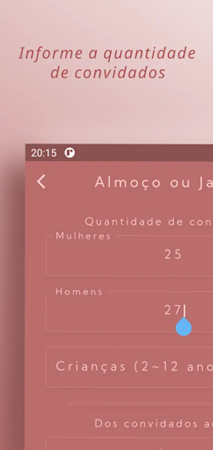 Get the amount of food and drinks for your party or event easily and quickly simply by informing the type of event, the number of guests, which food and drinks will be offered and you will get a list with the calculated quantities.