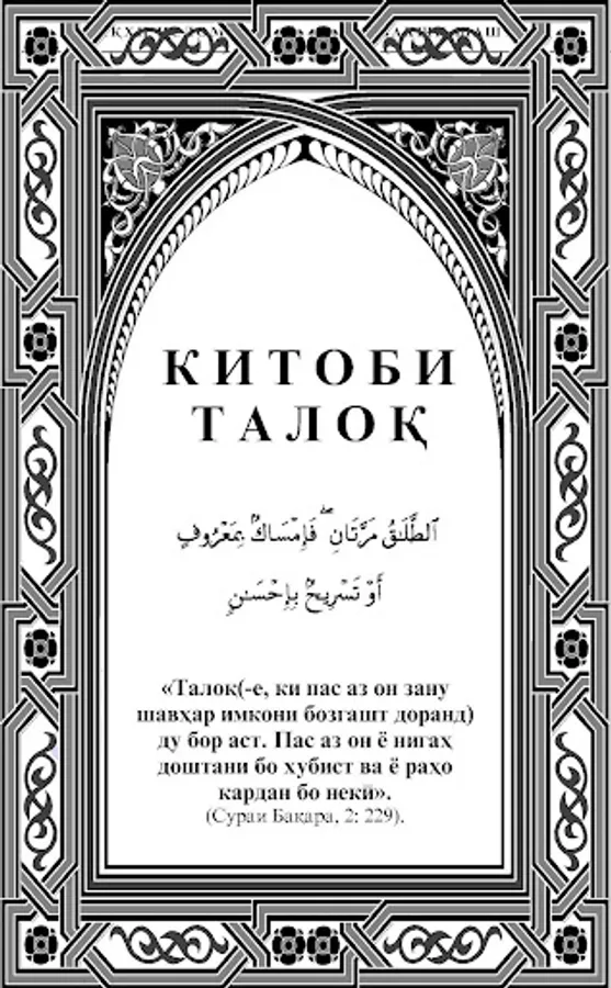 Az John ҷost, ki gift suhanoni garonmoyai paёmbari Islom (c) mebinem, ki ba taloқro unvoni noguvortarin Islands badtarin ҳalolҳo gift nazdi guftaast's bad. (1) E gift ҷoi Digard baёn shudaast: Zane, ki baa ҳeҷ uzre al shavҳarash darhosti taloқ namoyad, bӯi biҳisht ba mashomash (dimoғash) namerasad, yane darҳoi biҳisht bar rӯyash basta ast. (2)