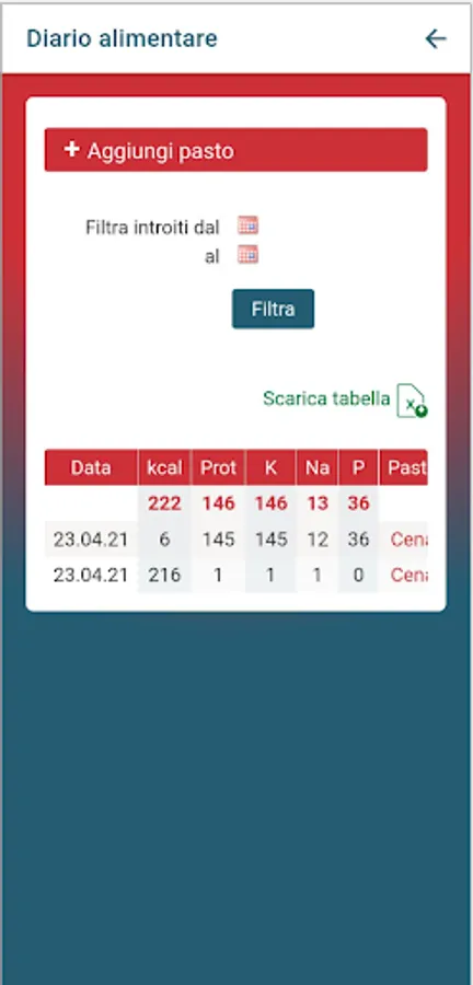 FOOD DIARY: keep under control the value of kcal, proteins, potassium, sodium and phosphorus taken at each meal.
