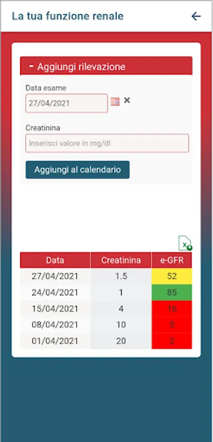 MONITORING THE KIDNEY FUNCTION: enter the creatinine value and the date of the last exam, the app will automatically indicate the e-GFR value. Download the file with your recordings and share it with your nephrologist.