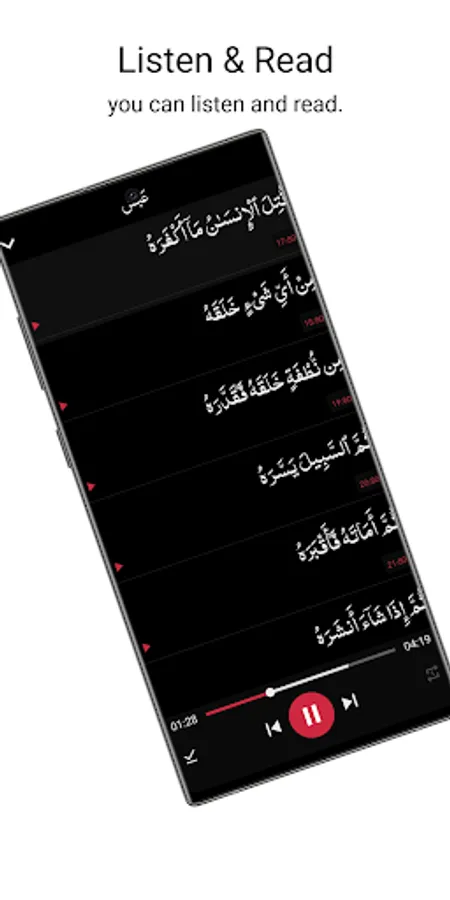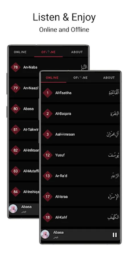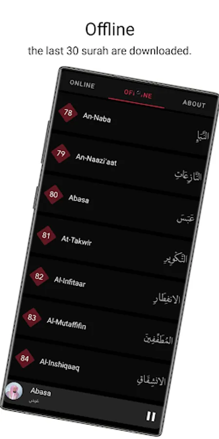 and in the offline section you can listen the last 30 surah (Juz Alama)