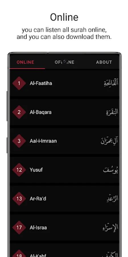 in online section you can to listen all Surah and you can downlaod any surah to be offline