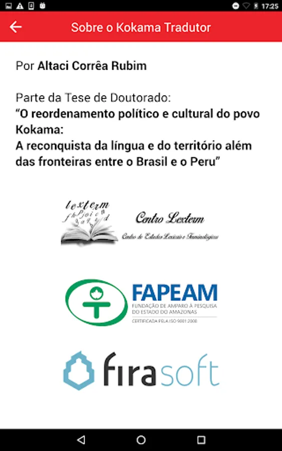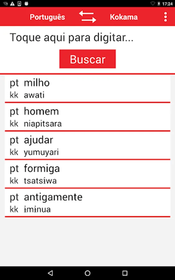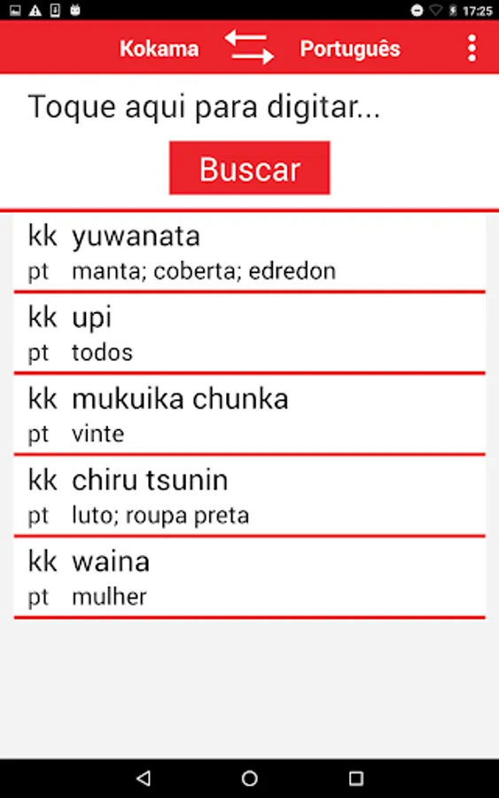 The translator is a Kokama Kokama-Portuguese dictionary for your Android device. It has more than 900 words of Kokama language, and does not require internet connection to function.
