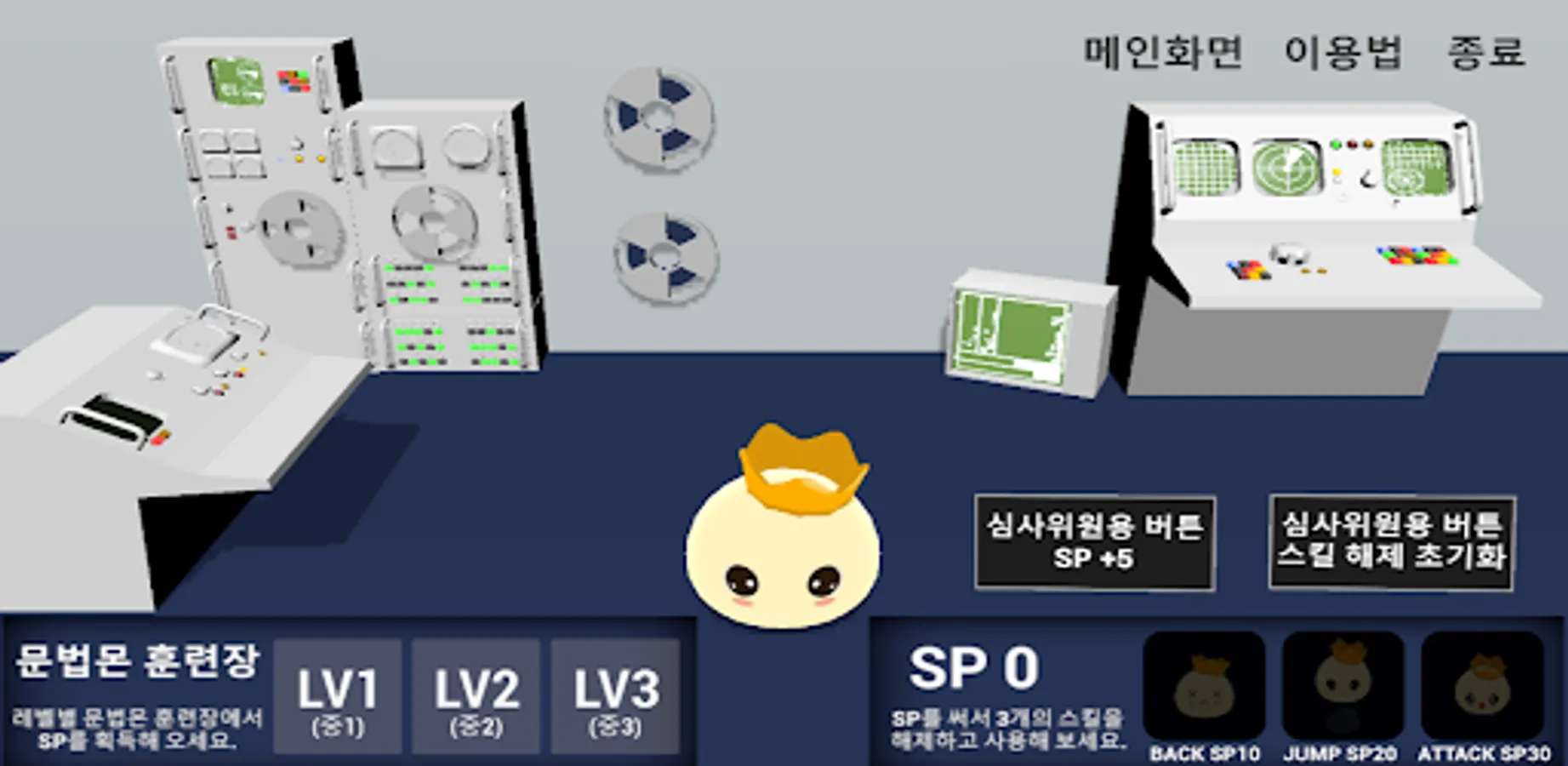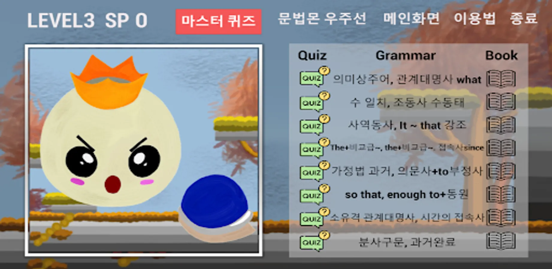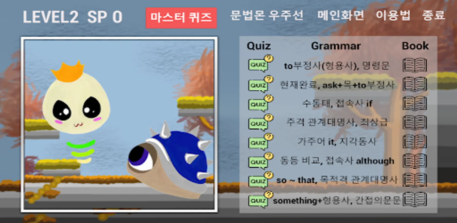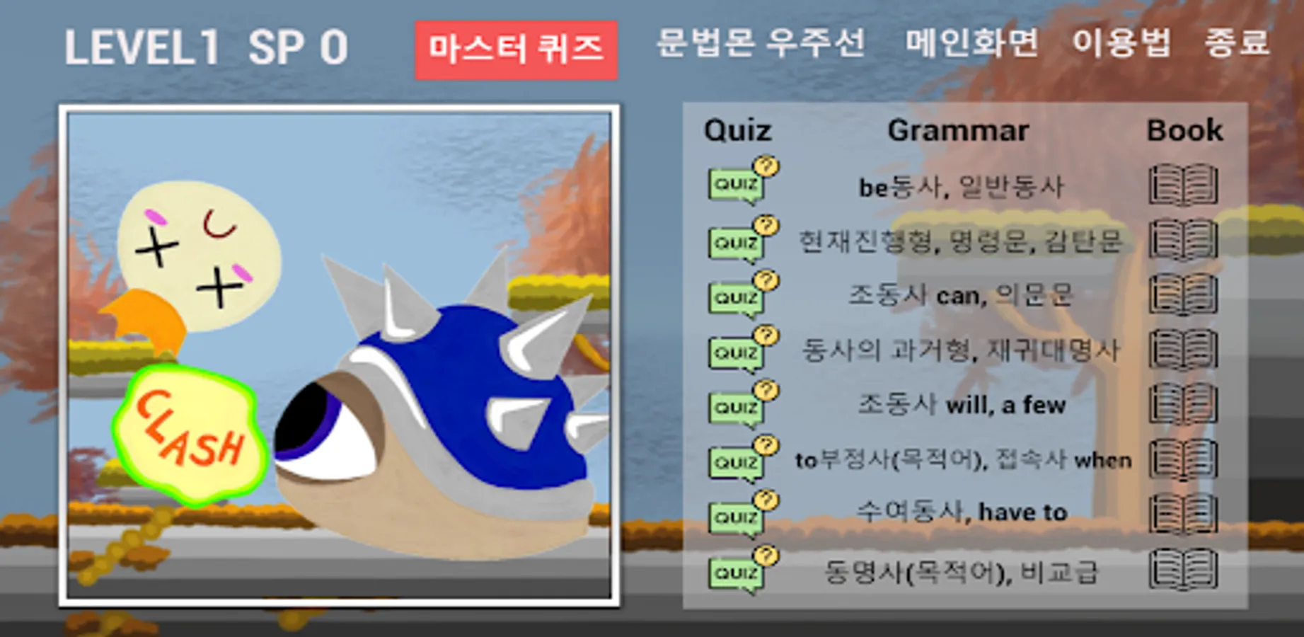 Middle school learners can learn grammar like a game. They can upgrade their grammar level by beating grammar quiz stages and accumulating skill points. The final goal of this application is to defeat the grammar-destroying monster by acquiring all the skills through using skill points and conquering all grammar master quizzes.