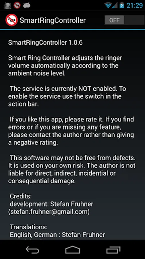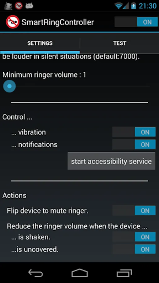SmartRingController sets the ringer volume according to the ambient noise when an incoming call is received. If the silent mode or the vibrate mode is enabled the app does not change the volume.