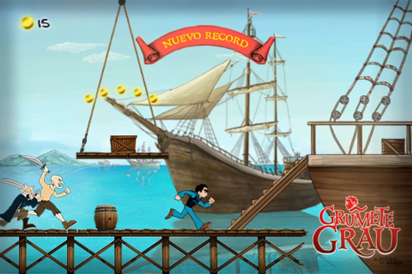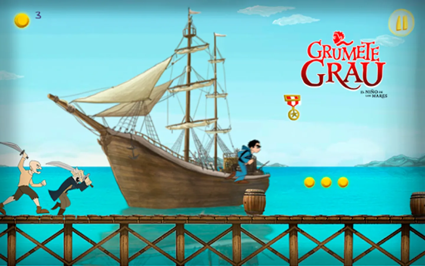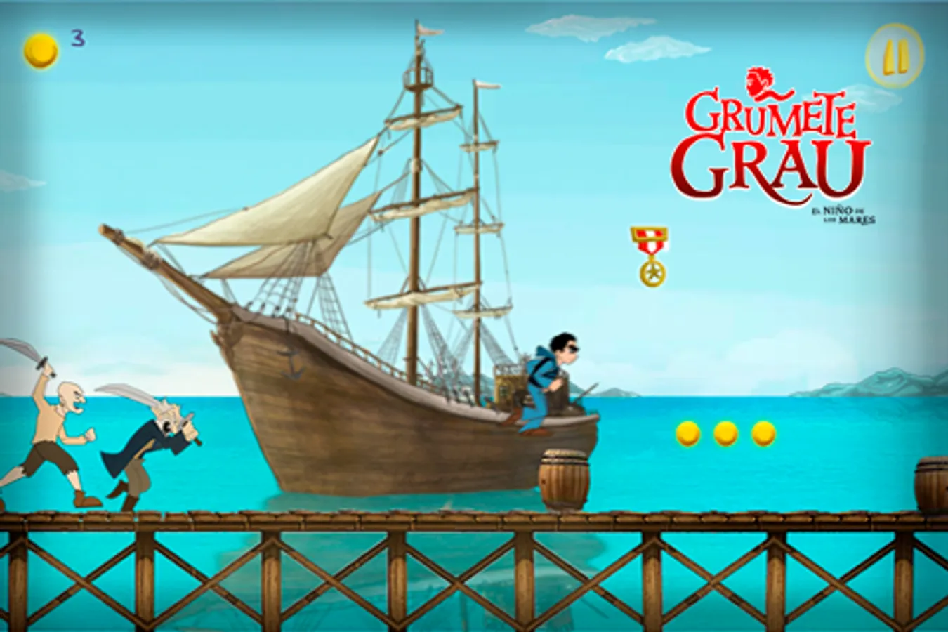 Help Grumete Grau to rescue Zí. She is trapped by dangerous pirates. In the way you'll find risks and rewards. Don't forget to pick up the medals that will help you to accomplish your mission. Remember if it takes you too long the pirates will catch you. Collect 100 coins and you will save Zi. To the rescue!