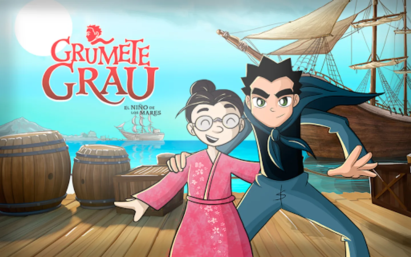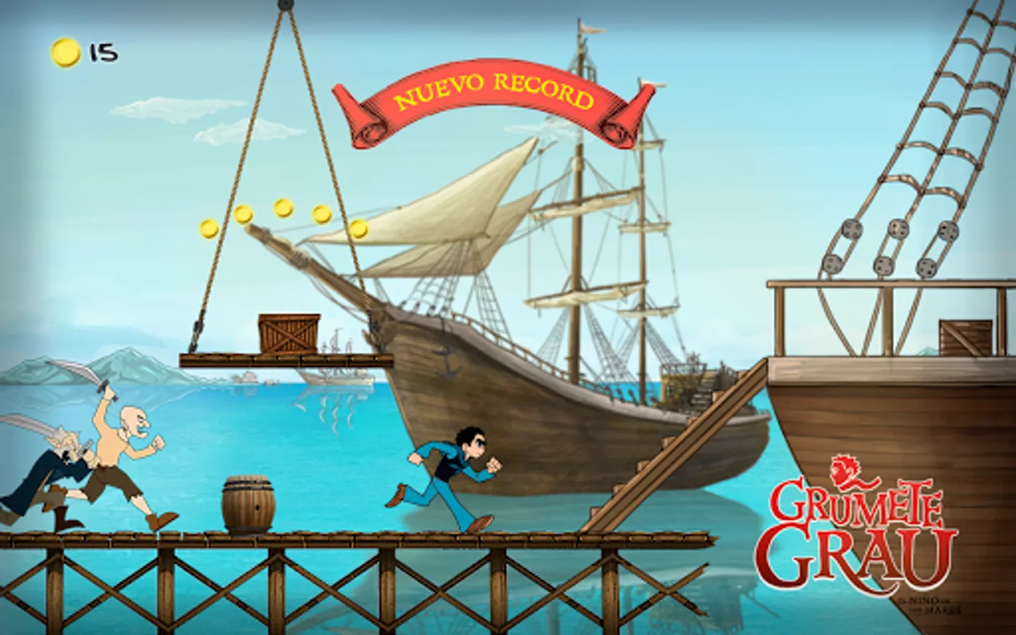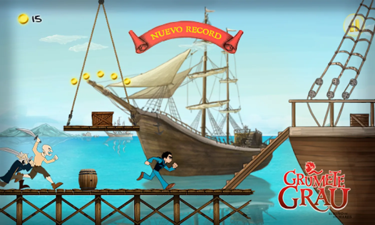 Help Grumete Grau to rescue Zí. She is trapped by dangerous pirates. In the way you'll find risks and rewards. Don't forget to pick up the medals that will help you to accomplish your mission. Remember if it takes you too long the pirates will catch you. Collect 100 coins and you will save Zi. To the rescue!