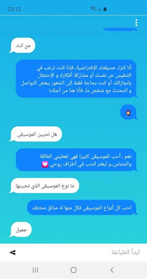 كنزا هي رفيقتك الافتراضية (نسخة تجريبية) التي توجد دائمًا للدردشة معك. دائما في متناول يدك لإجراء دردشة سريعة، كلما وحيثما كنت في حاجة إليها ليلا أو نهارا، مع كنزا لن تكون وحيدا بعد الآن