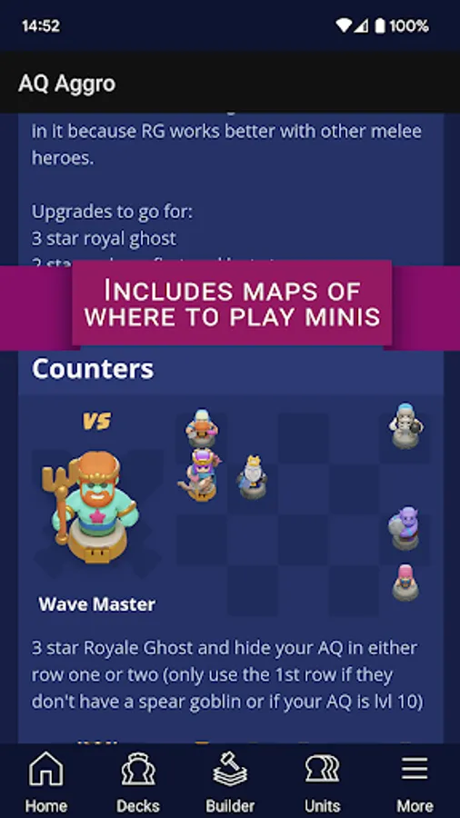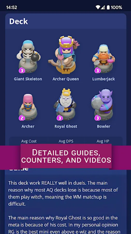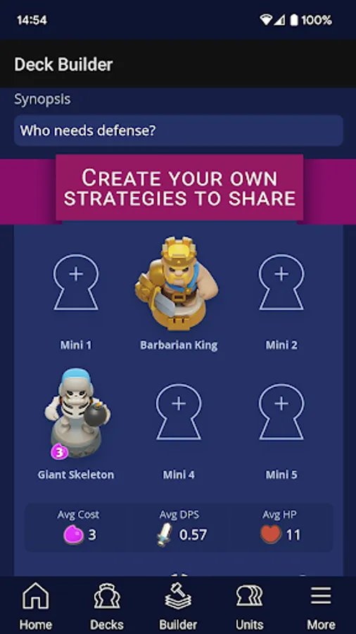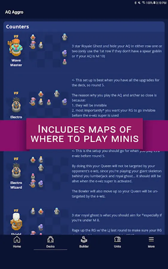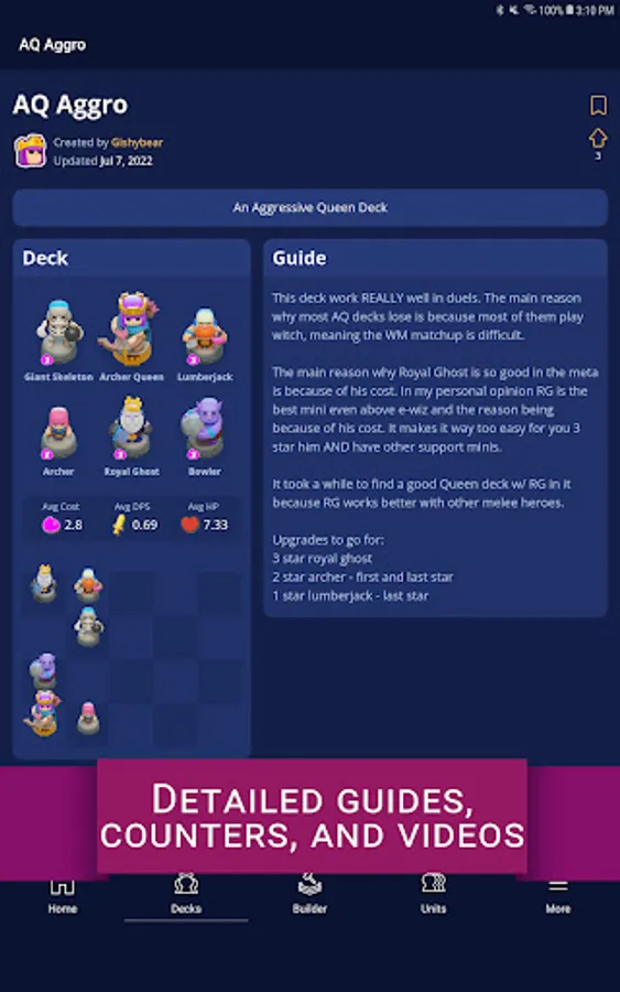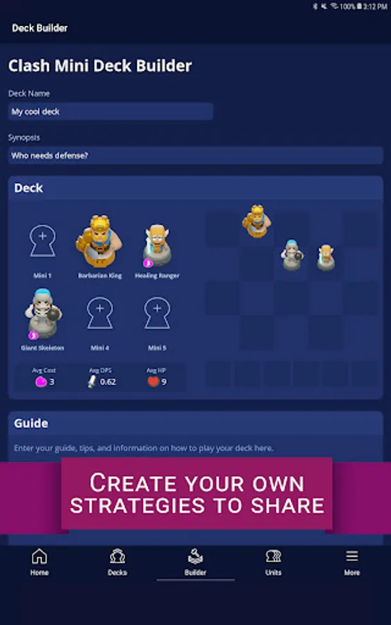 Decks for Clash Mini features hundreds of user submitted builds covering all of the heroes offered in the game. You’ll find a deck no matter the play style you prefer. The most popular decks even include counters and videos, in addition to detailed write ups. Start your journey to the legendary tier today with Decks for Clash Mini!