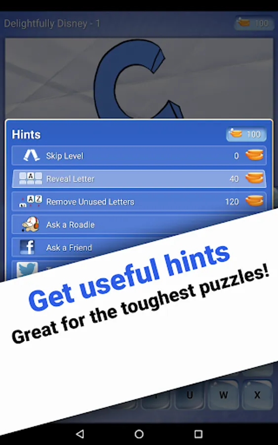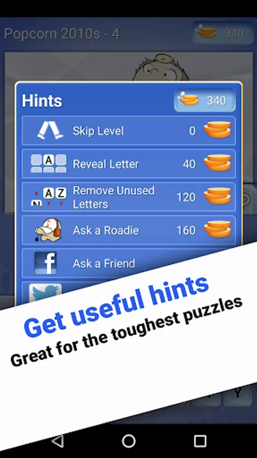 It's a shame this has to be a "feature." Play our game when you want it, however you want it. No time restrictions, no distractions in your status bar, no bugging your friends to move forward. If you're good at the game, play it all for free! If you want to buy-in and unlock everything up front, you can do that too. Skipping levels is free, so complete each category in whatever order you like! There is also a hint system for when you're stumped on a song.