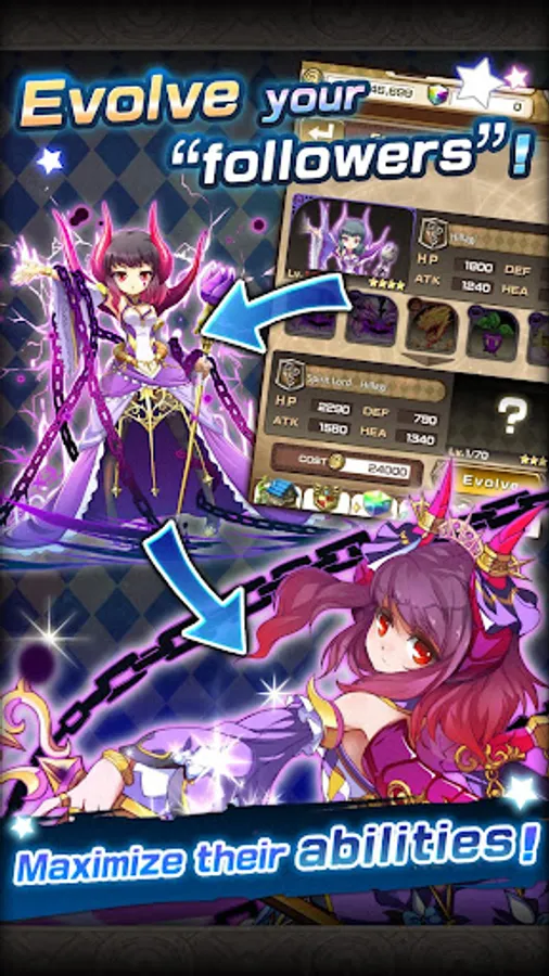 You can play casually in this turn-based battle optimized for one hand mobile play, or you can think hard about the composition, advantages and disadvantages of different followers. Swipe up or down to use super attack or charge your power! Beware! In nightmare level stages, you cannot continue the battle if you fail!