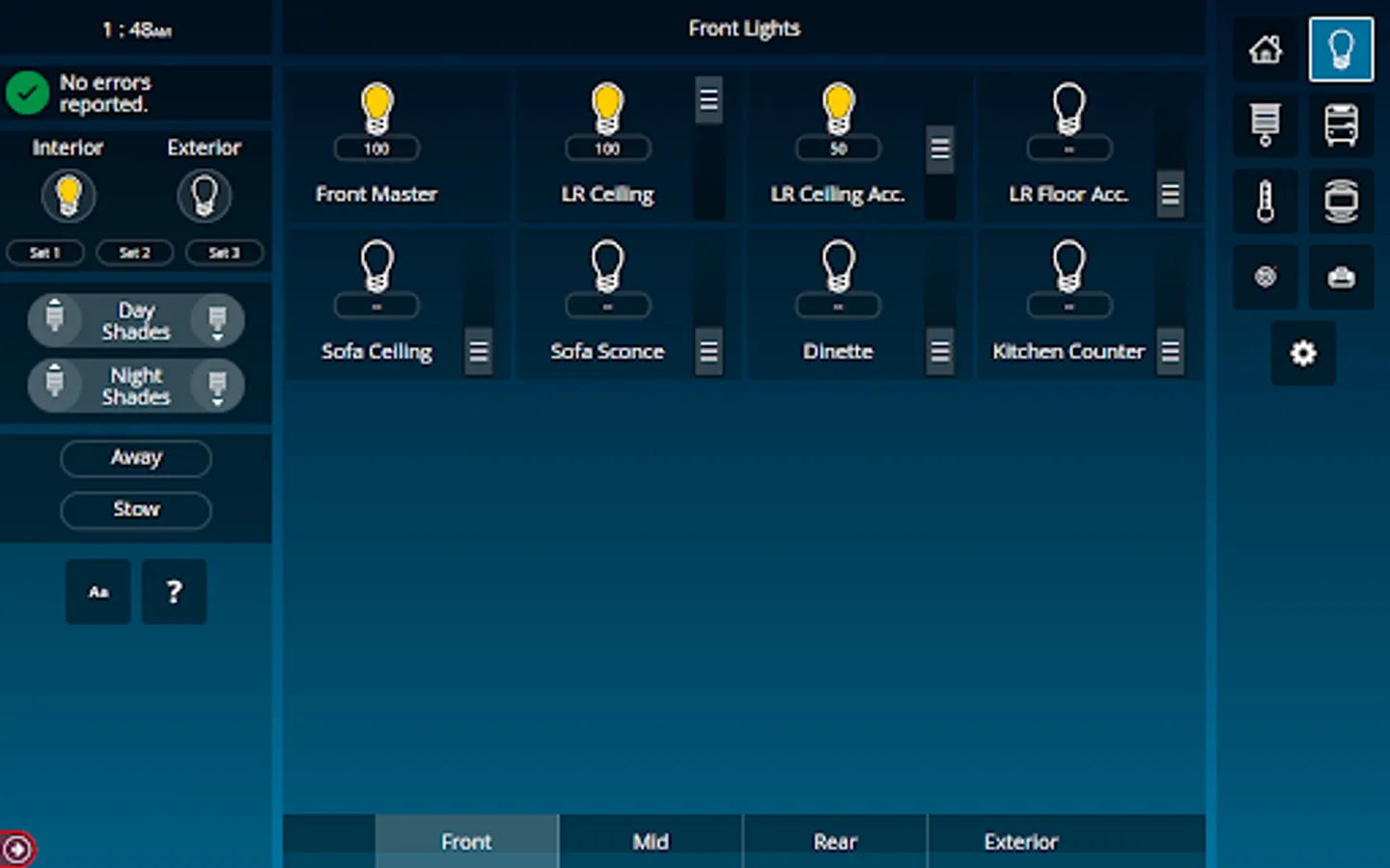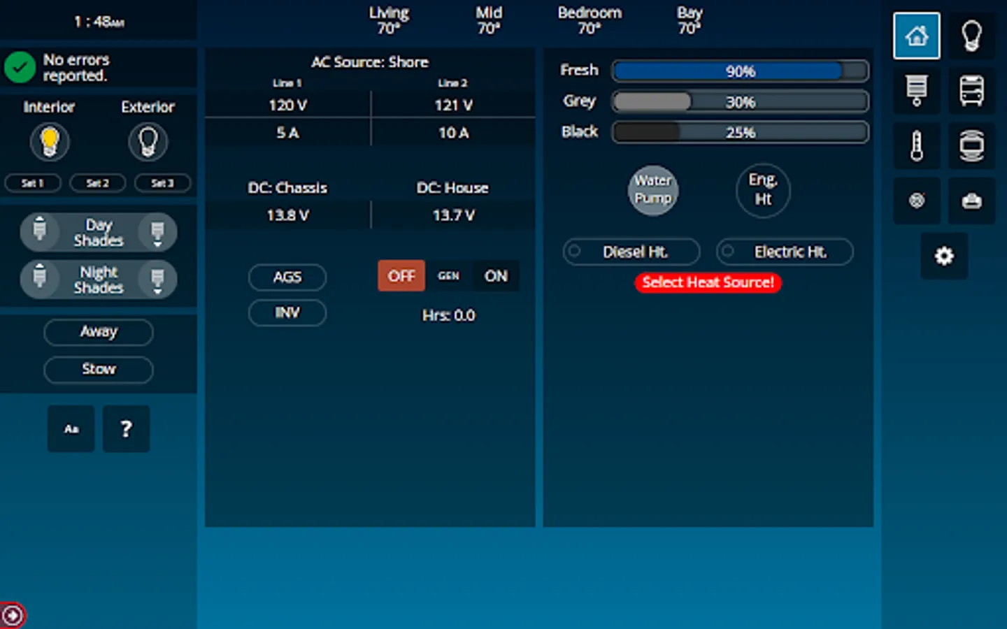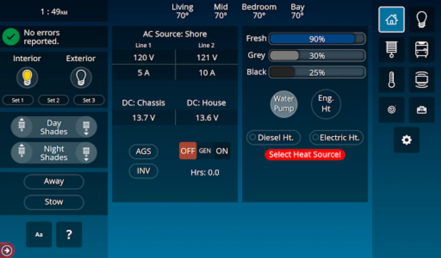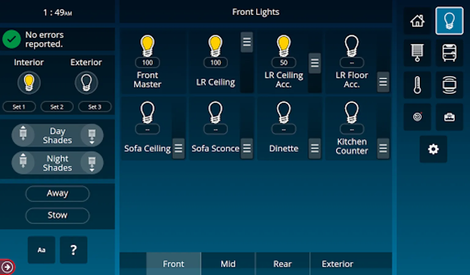 Vegatouch Aurora is a Universal coach control system packed into a clean, simple interface. The Vegatouch Aurora app can connect to a vast array of components to give you total control of all electrical, electronic, and mechanical systems from a smartphone or tablet. Pair your mobile device with your coach’s built-in interface to monitor and control various components.