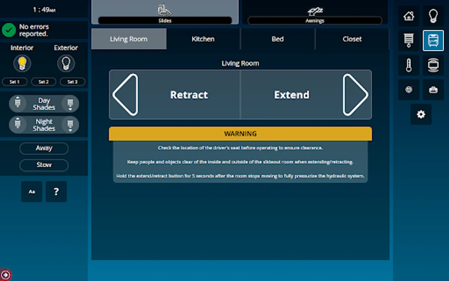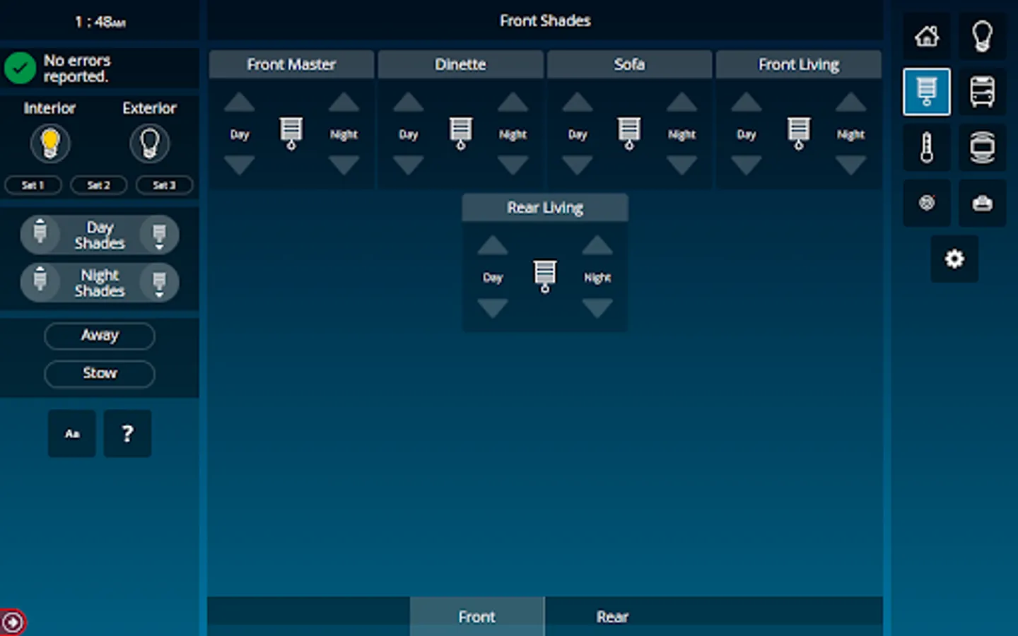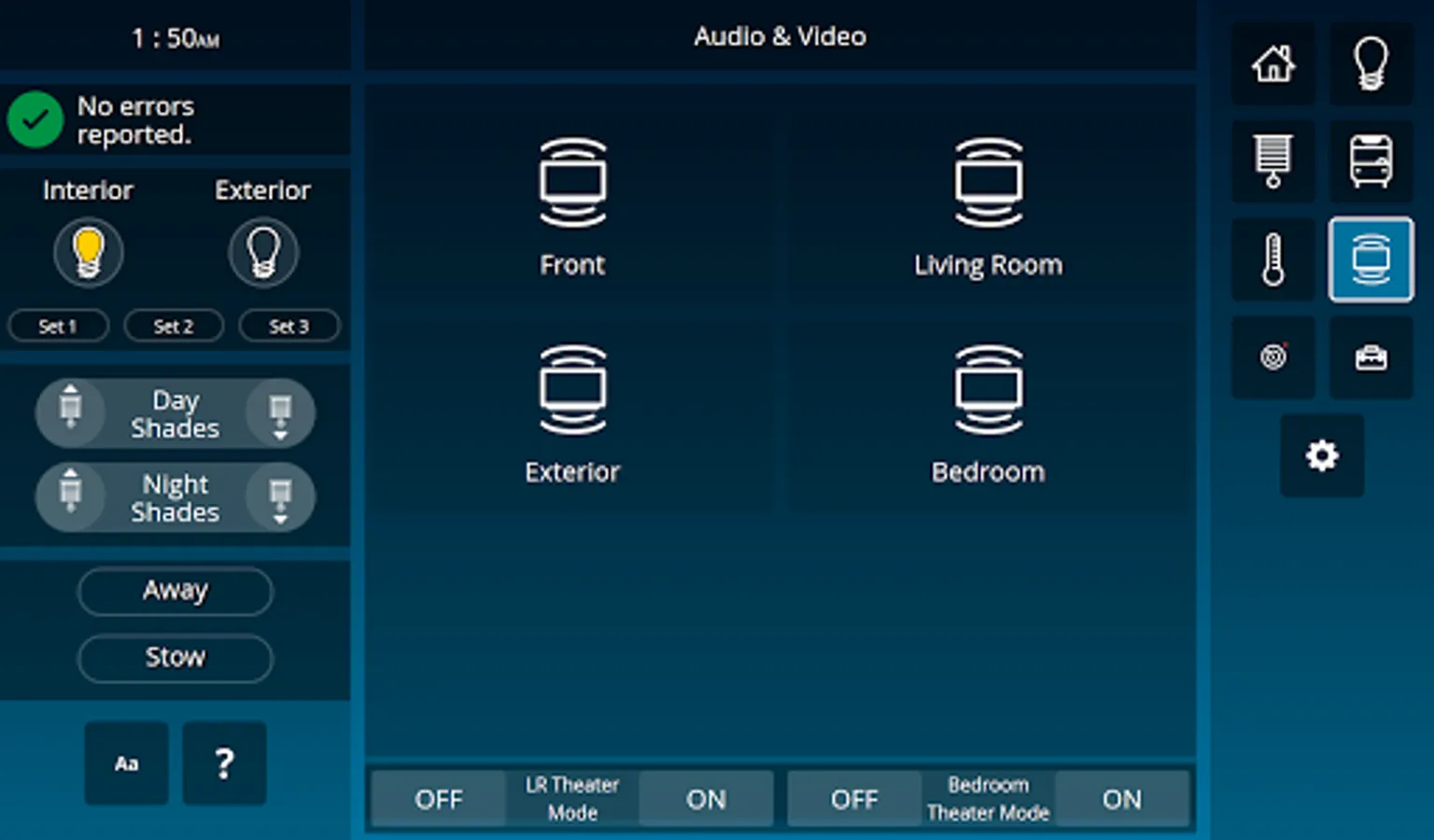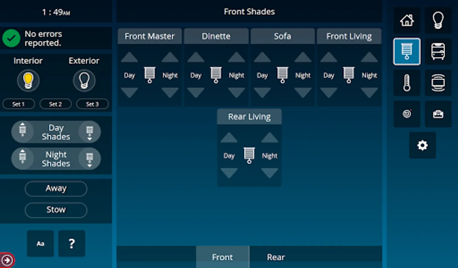 Vegatouch Aurora is a Universal coach control system packed into a clean, simple interface. The Vegatouch Aurora app can connect to a vast array of components to give you total control of all electrical, electronic, and mechanical systems from a smartphone or tablet. Pair your mobile device with your coach’s built-in interface to monitor and control various components.