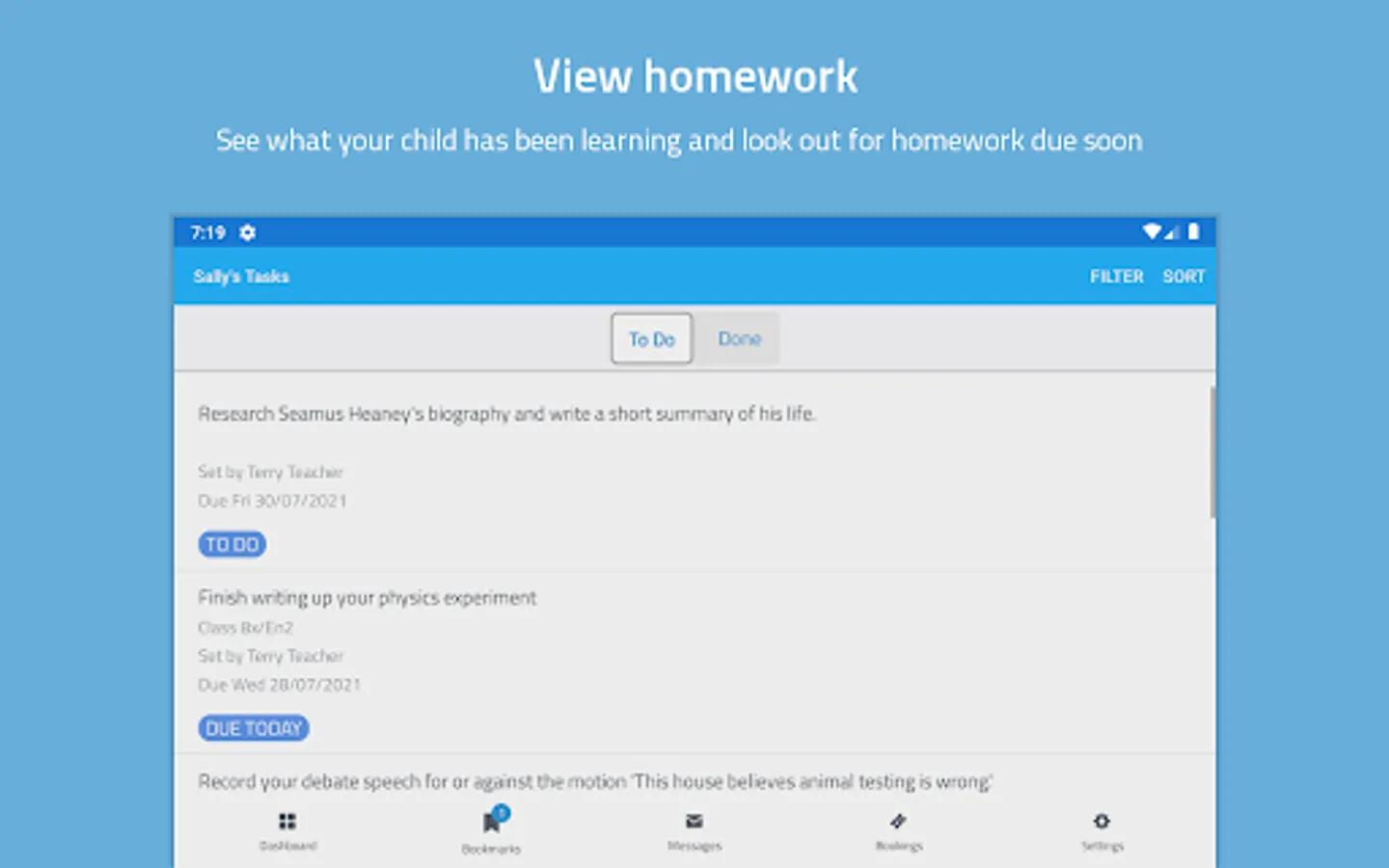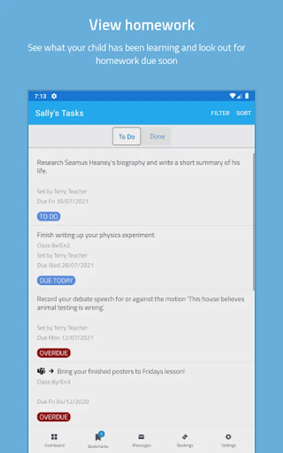 You’ll be able to see when homework is set, when it is due and have easy access to the same learning resources your child is using. You can also get important announcements and messages, such as for upcoming school trips, or Parents’ Evenings straight to your phone.