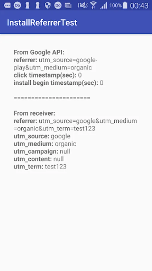 https://play.google.com/store/apps/details?id=com.firemaples.installreferrertest&referrer=utm_source%3Dgoogle%26utm_medium%3Dorganic%26utm_term%3Dtest123