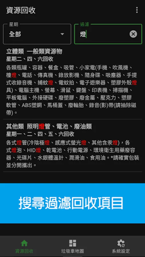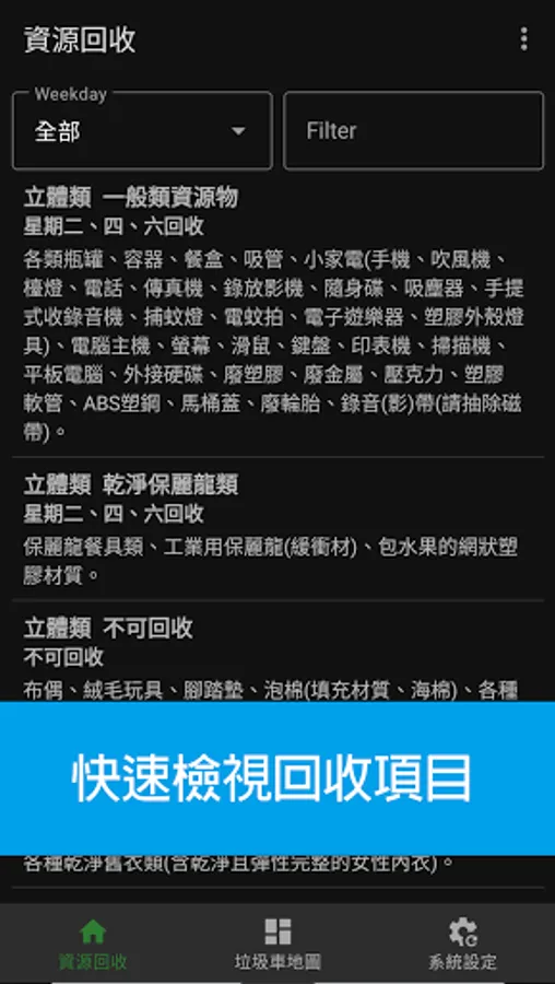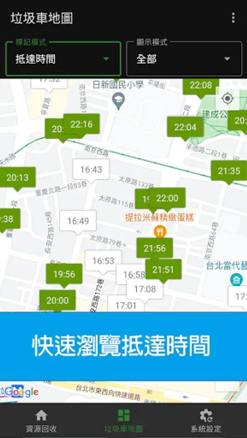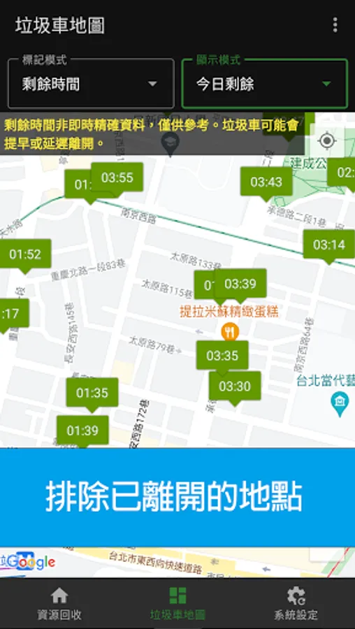 Displays the trash collecting locations with the arrival time or remaining time.