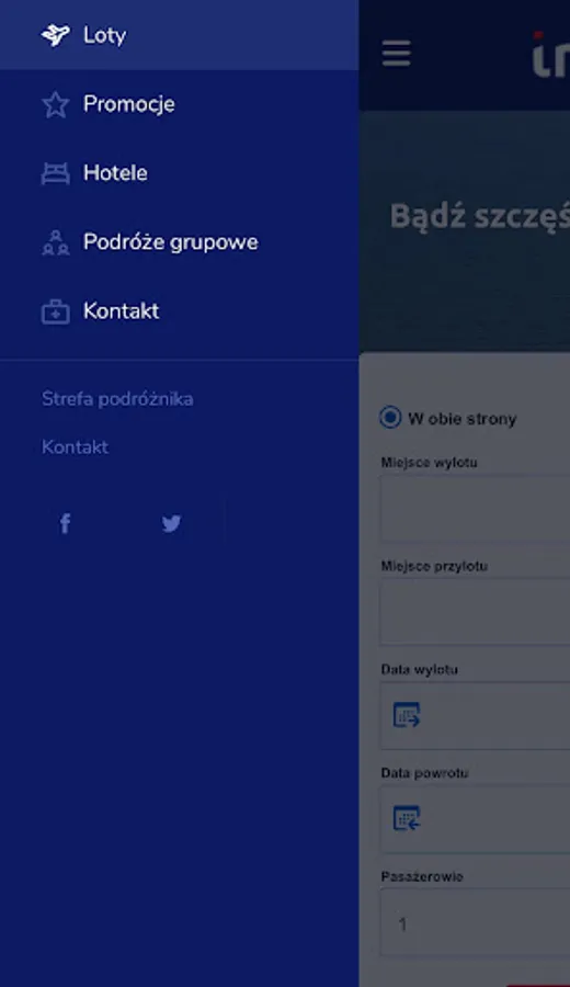 The application home screen gives you access to the simplified flight search engine - choose the place of departure, destination, departure and return date
