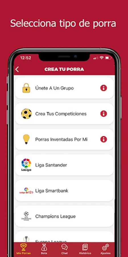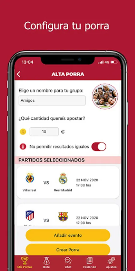 3. Create your competitions: haven't you had enough yet? Well, with this option you will be able to create a soccer Porra for matches that are not official, such as, for example, teams from your neighbourhood, your town, a university competition ... Create the Porra, put the name and if you want a photo of the badges of teams, select a deadline to play and submit! All members of your Porra group will be able to make their predictions for that match. After the maximum date of play, the creator of the Porra group must indicate which was the final score.