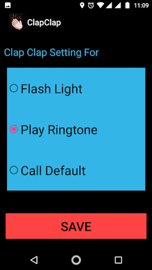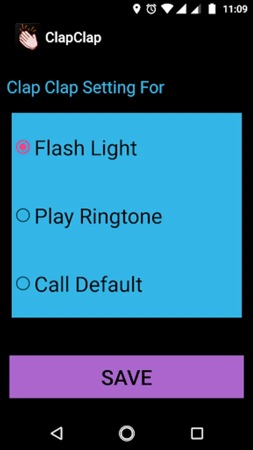 "Clap Clap" is android Application which is using for Flashlight On, Playing Music by Clap sound and Call default Phone Number.