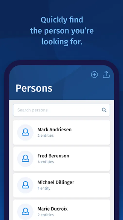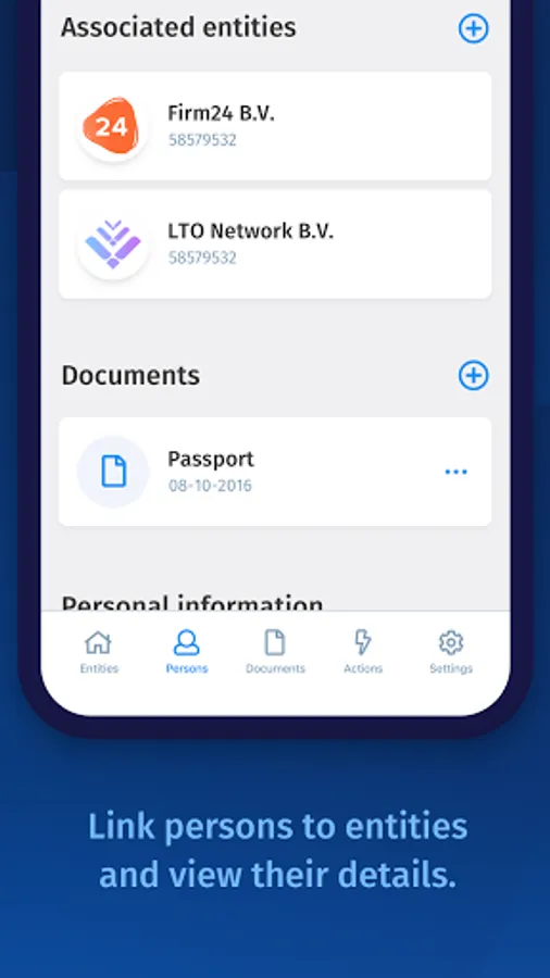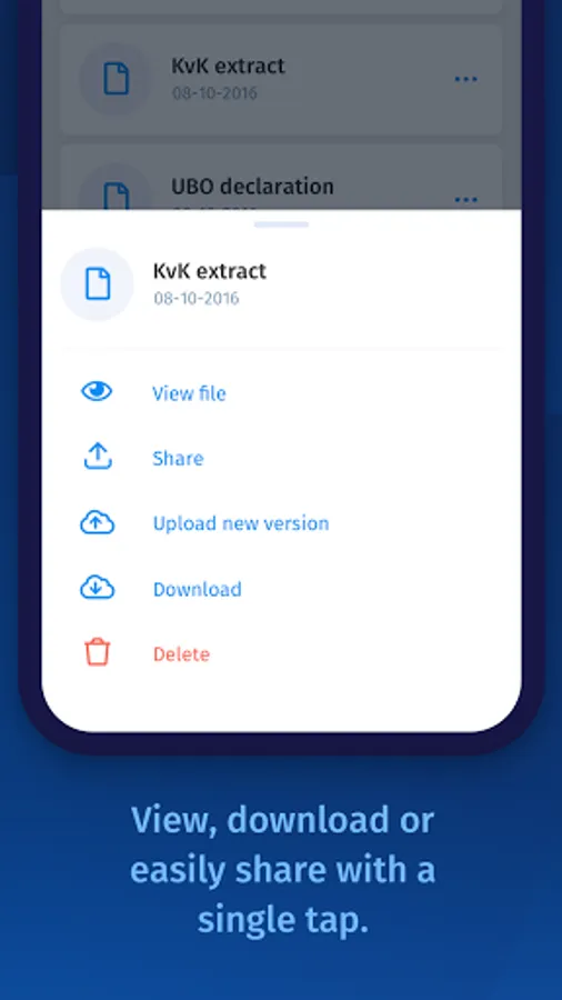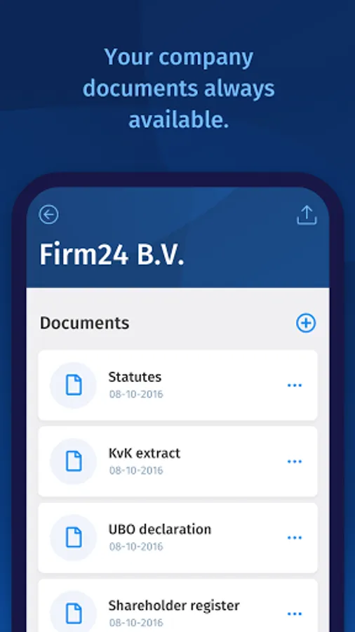 You can easily manage all documents and information of all your companies in one simple overview. Examples of documents are: the statutes, Chamber of Commerce extract, UBO statement and shareholders register.